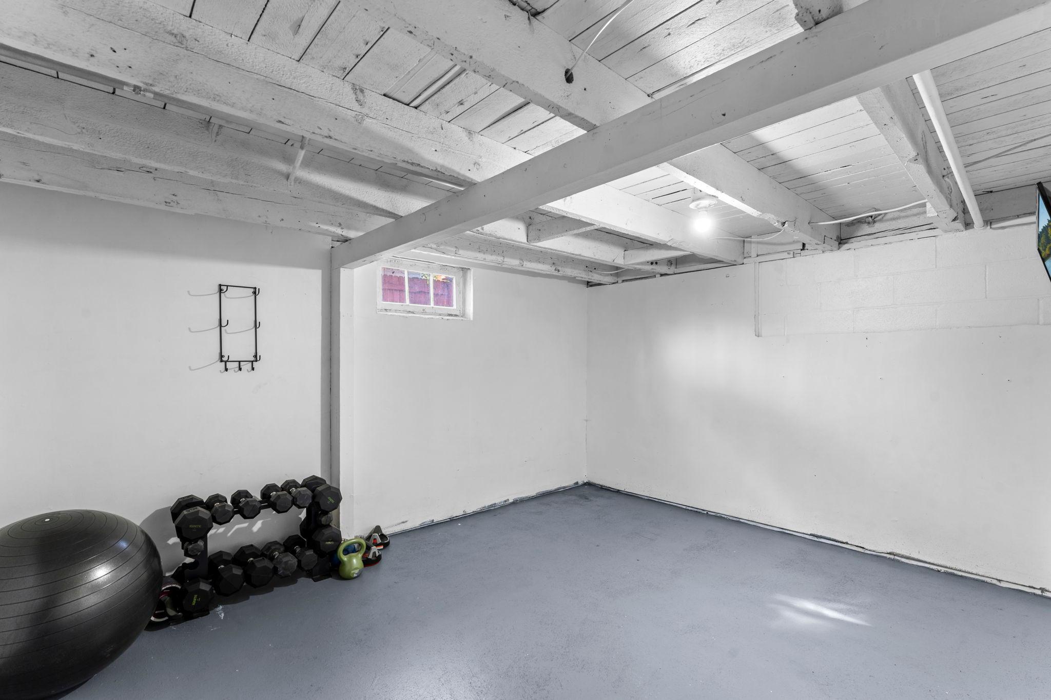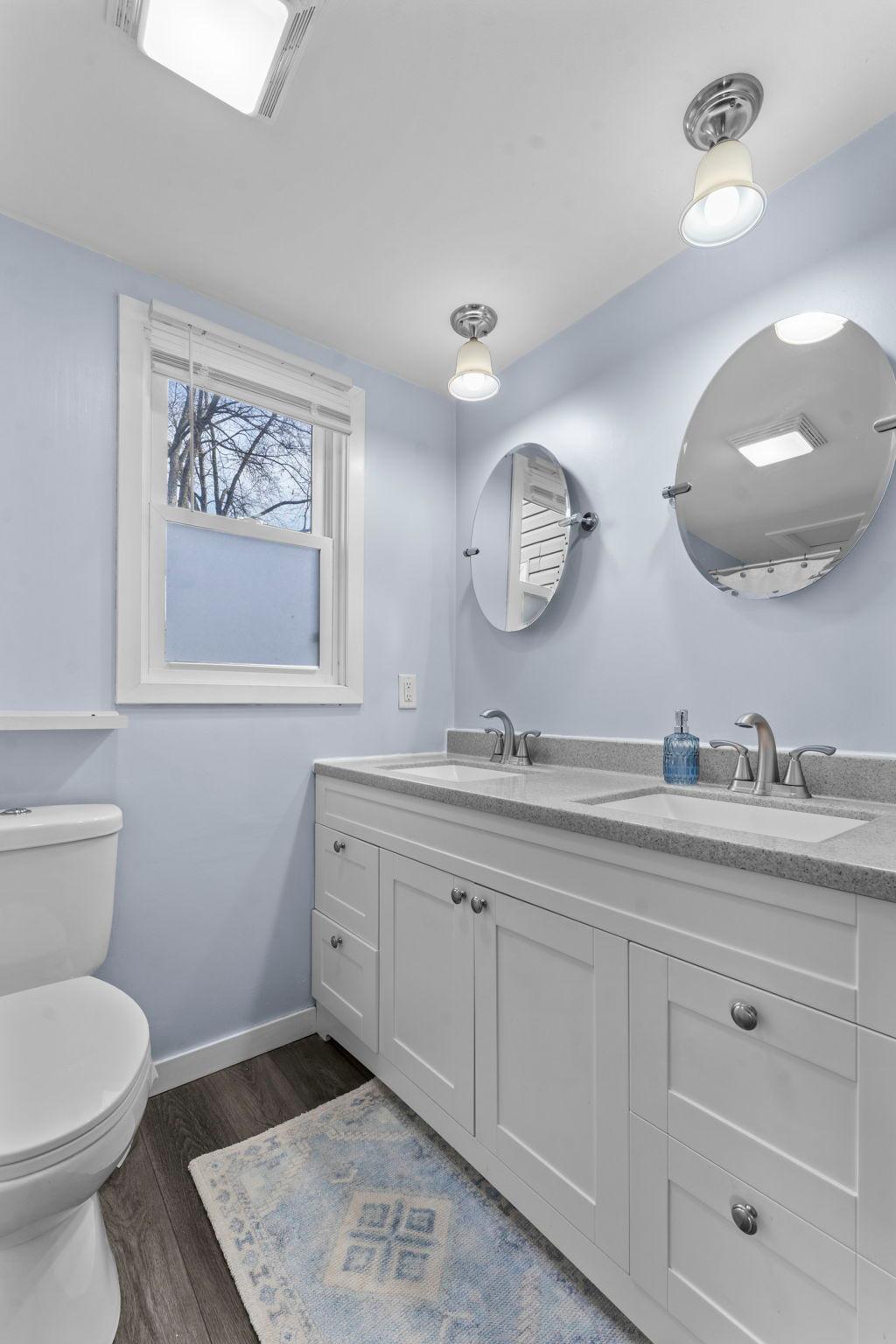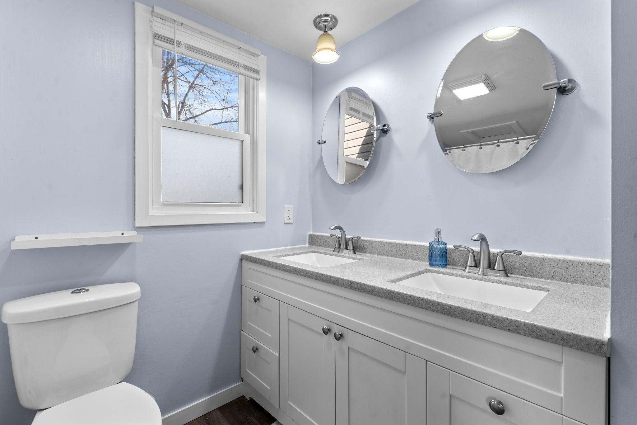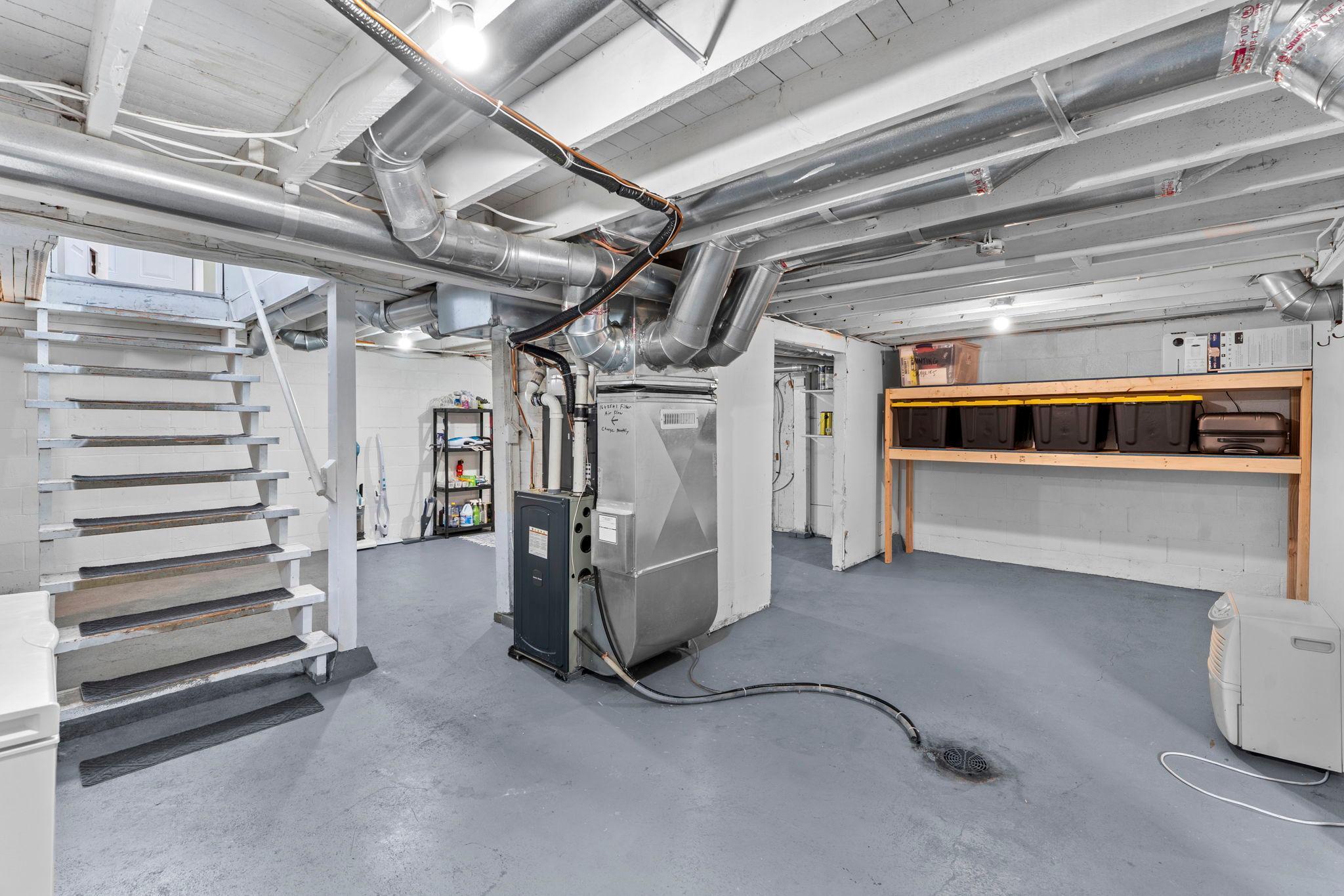 The main level features two generously sized bedrooms and a full bathroom with a double vanity and ample storage. The lower level offers a wide-open basement with a laundry area, abundant space for storage or recreation, and a convenient 1/4 bath (toilet in place) with potential to finish into a full bathroom.