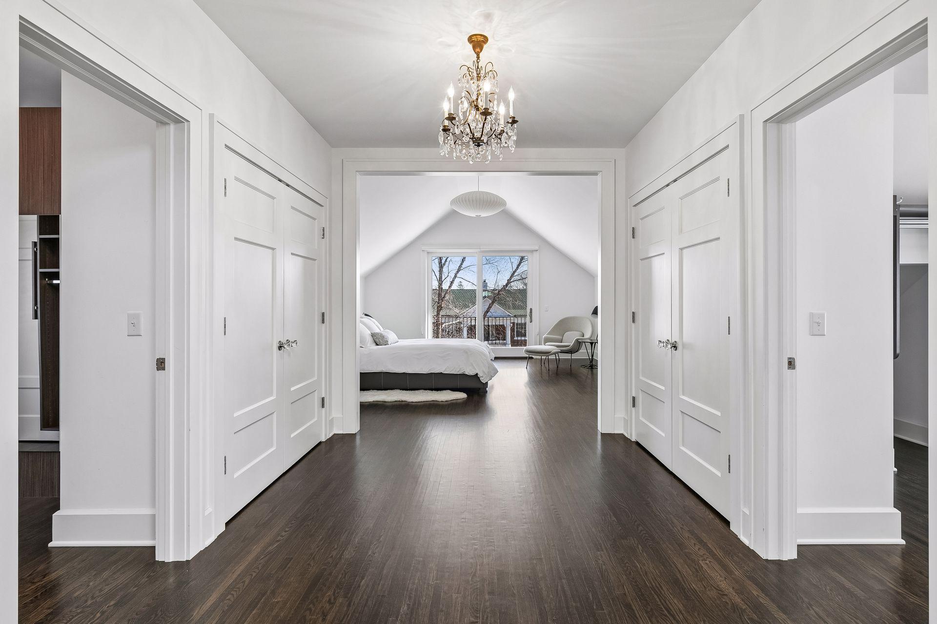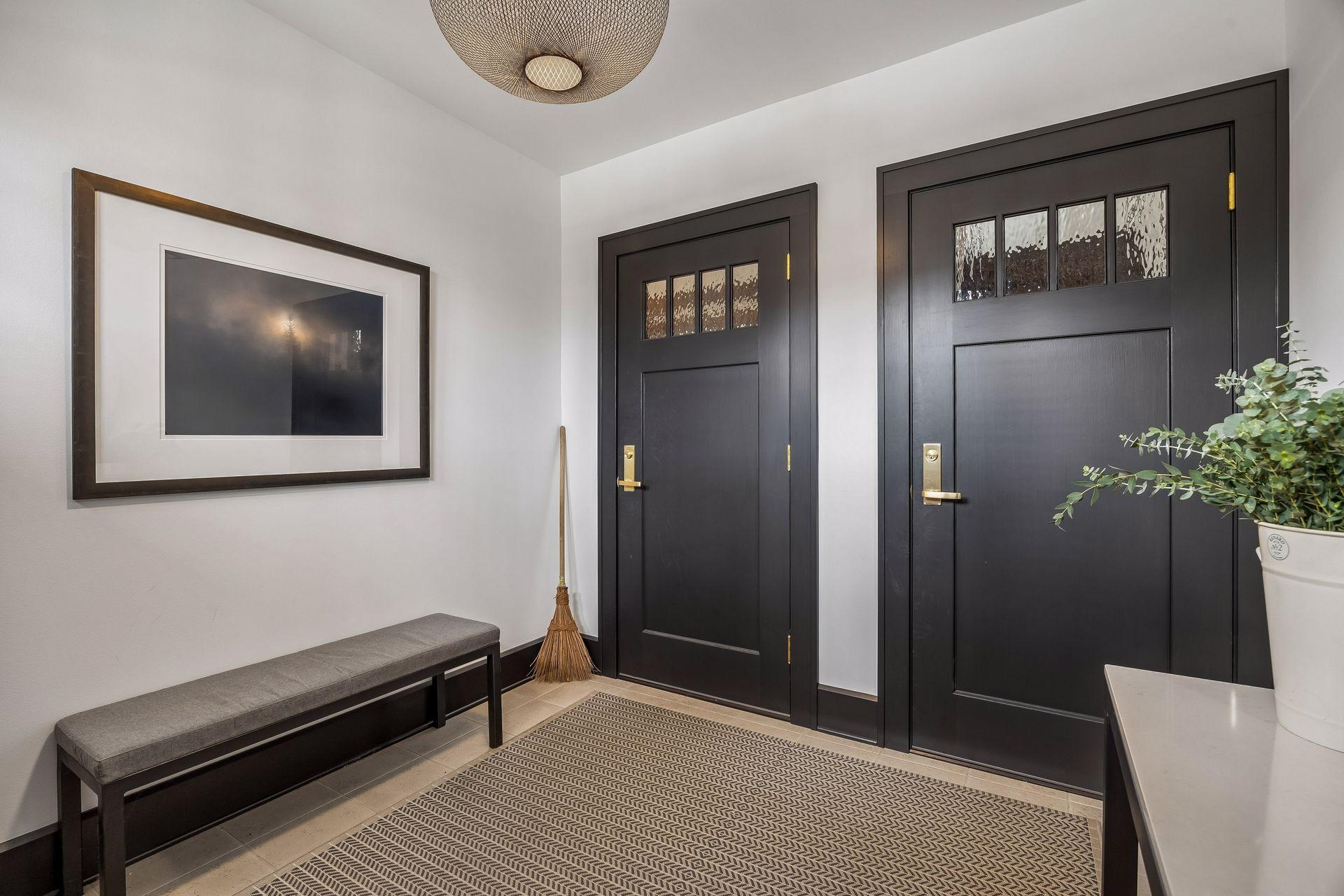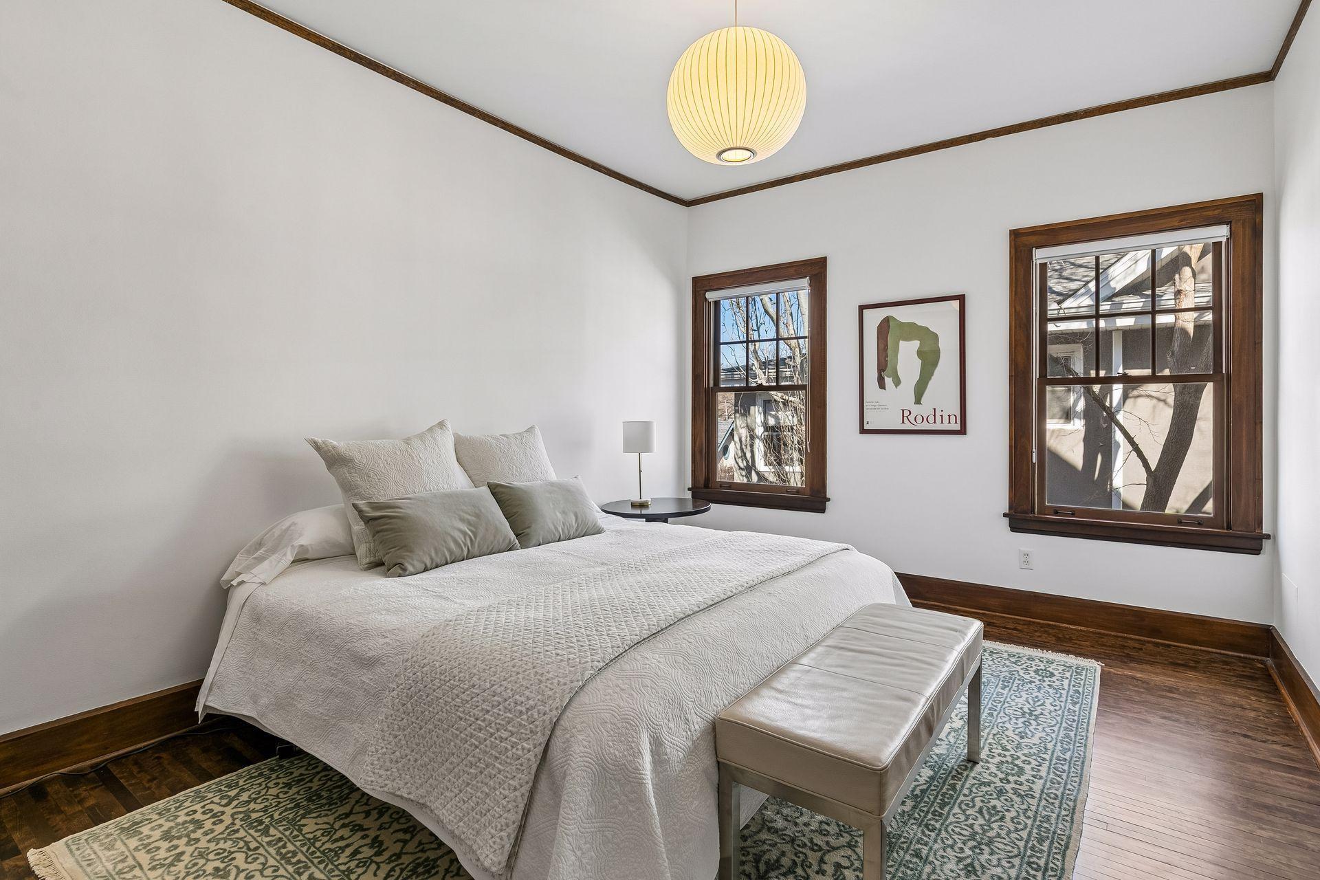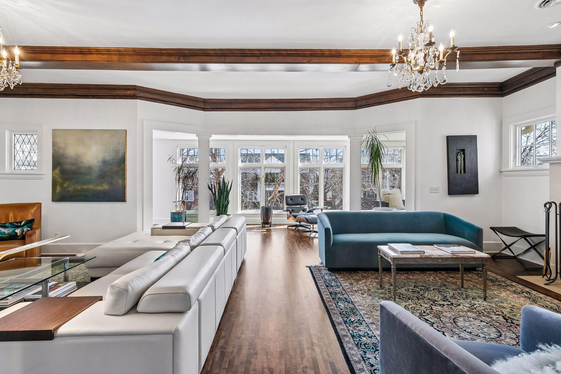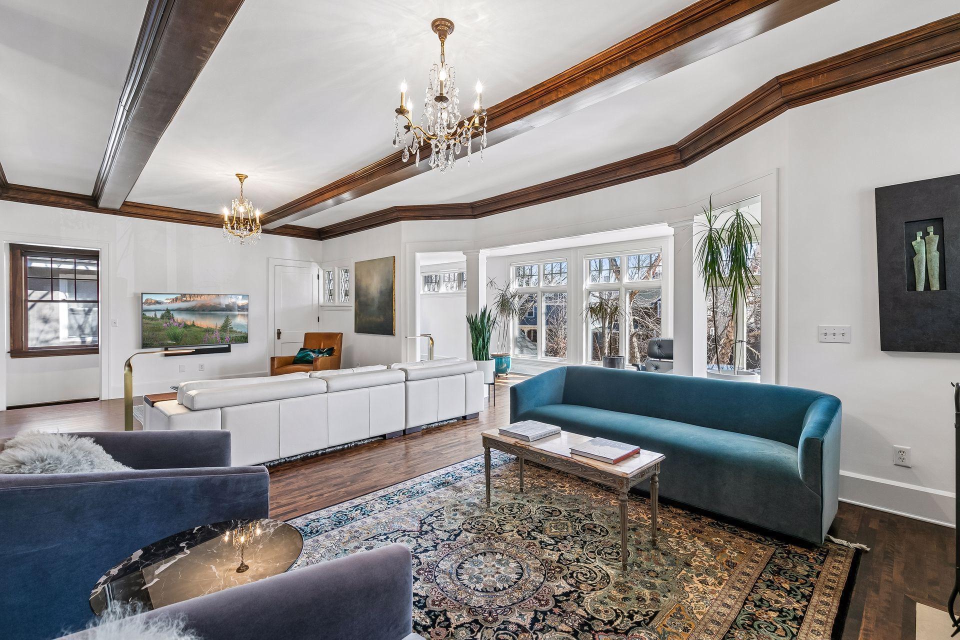 Remodeled 4BR + den condo in the desirable East Isles neighborhood. The property features attractive curb appeal, an updated arched entrance, and a modern front door surrounded by well-maintained landscaping, seasonal flowers, and mature canopy trees. Welch Forsman Associates completed renovations that emphasize modern design elements, integrating them thoughtfully with turn-of-the-century charm and craftsmanship to produce attractive, practical living spaces throughout the property. The expansive living room includes an adjacent sunroom, distinguished by a wall of windows allowing for an abundance of natural light to pour through. Elegant wood beams accentuate the high ceilings, seamlessly integrating with the built-in dining room buffet. The kitchen, illuminated by natural light, offers generous cabinet storage, a central island, and an elegant tile backsplash. The main floor features in-unit laundry, three bedrooms and a den, complemented by primary suites on both the main and upper levels. The upper-level ensuite serves as a private retreat, offering two balconies, a sitting room, several walk-in closets, and a bathroom equipped with a soaking tub and walk-in shower. Ample storage in the lower level and attached garage. A short walk to all that Lake of Isles has to offer.