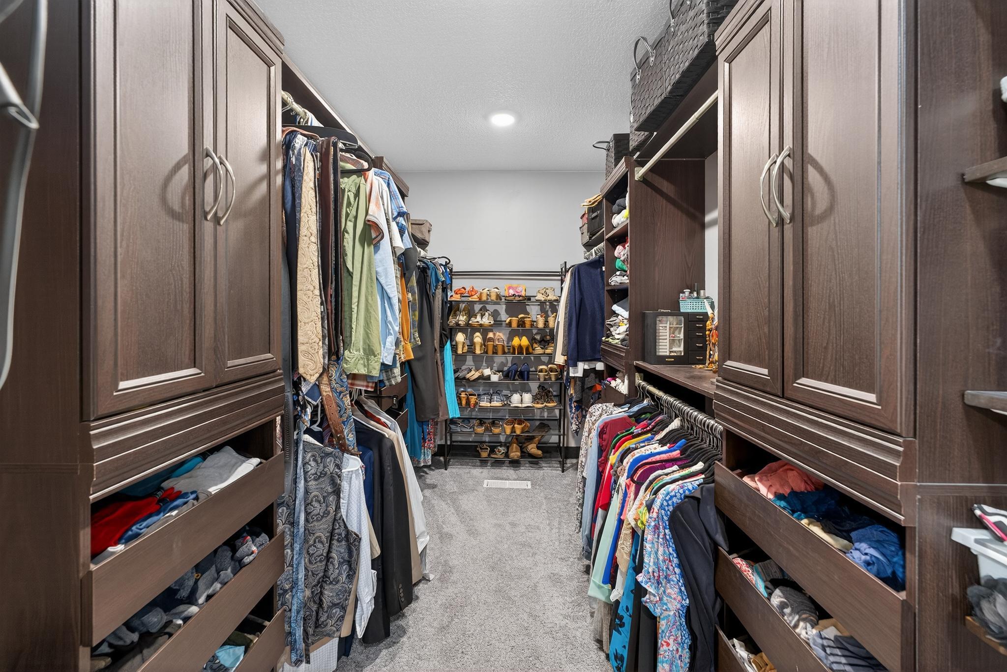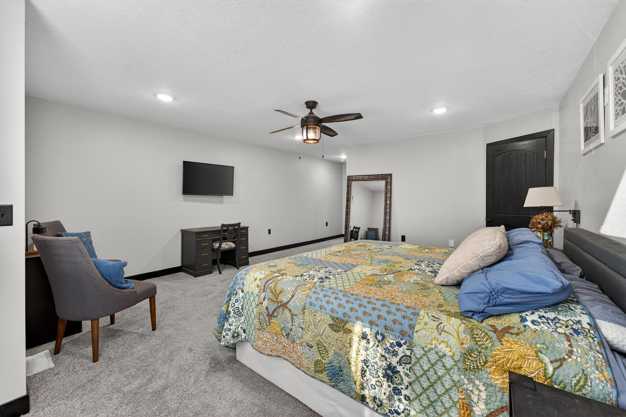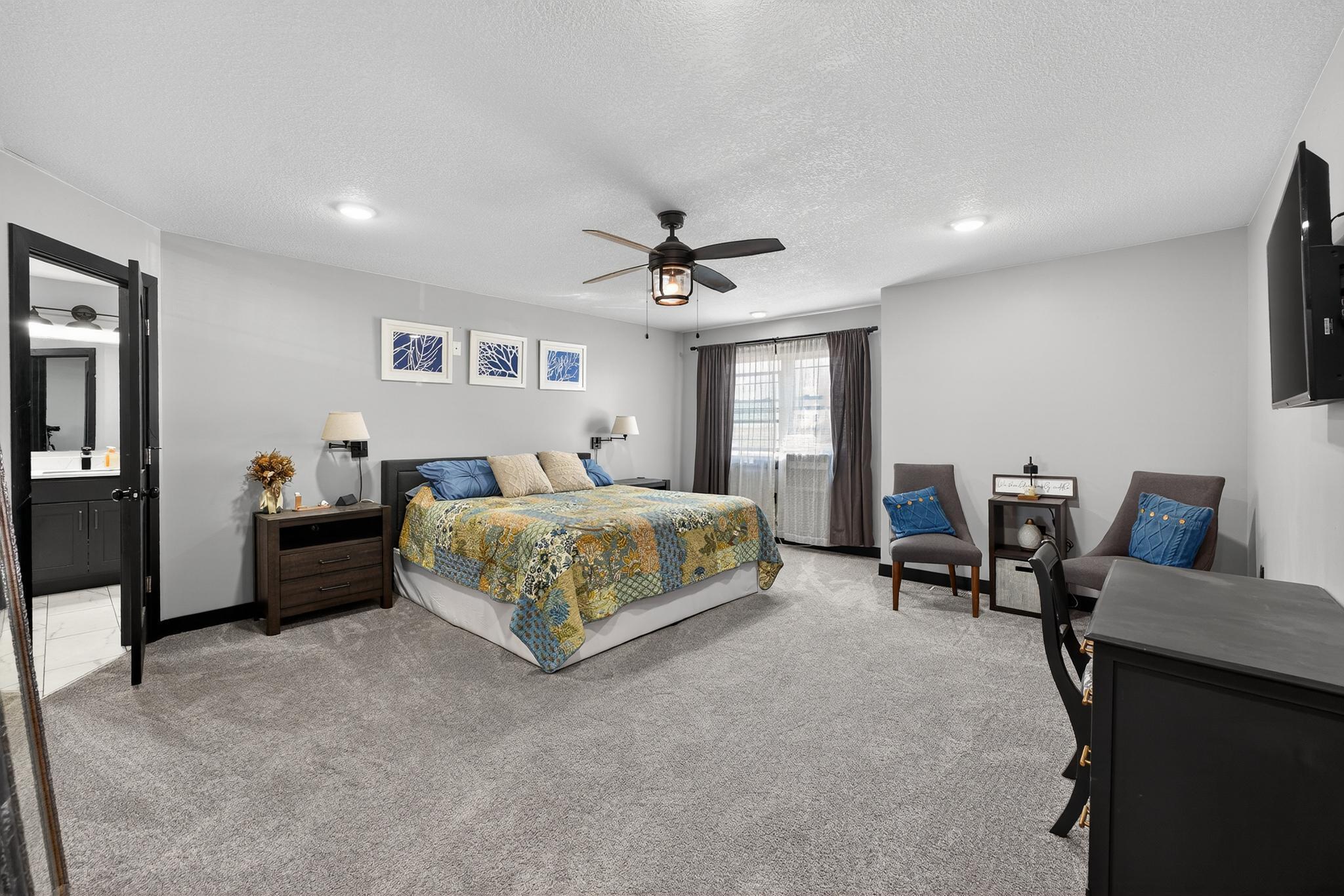 Four of the bedrooms are located on the same level, along with the laundry, offering a convenient and functional layout. Two of the bedrooms include private ensuite bathrooms, and the owner’s suite provides a spacious retreat with a 24x16 layout, soaking tub, rain shower, walk-in closet, and a mini refrigerator.