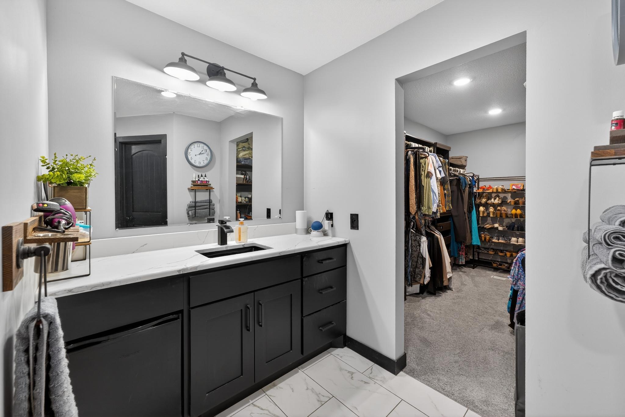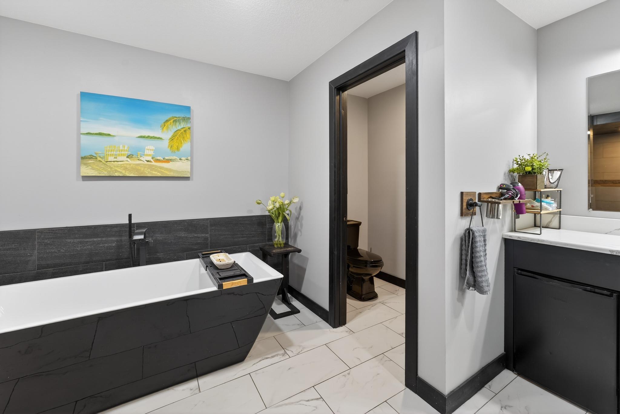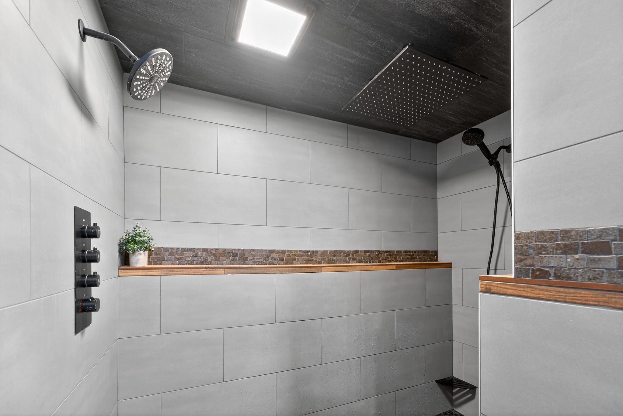 Four of the bedrooms are located on the same level, along with the laundry, offering a convenient and functional layout. Two of the bedrooms include private ensuite bathrooms, and the owner’s suite provides a spacious retreat with a 24x16 layout, soaking tub, rain shower, walk-in closet, and a mini refrigerator.