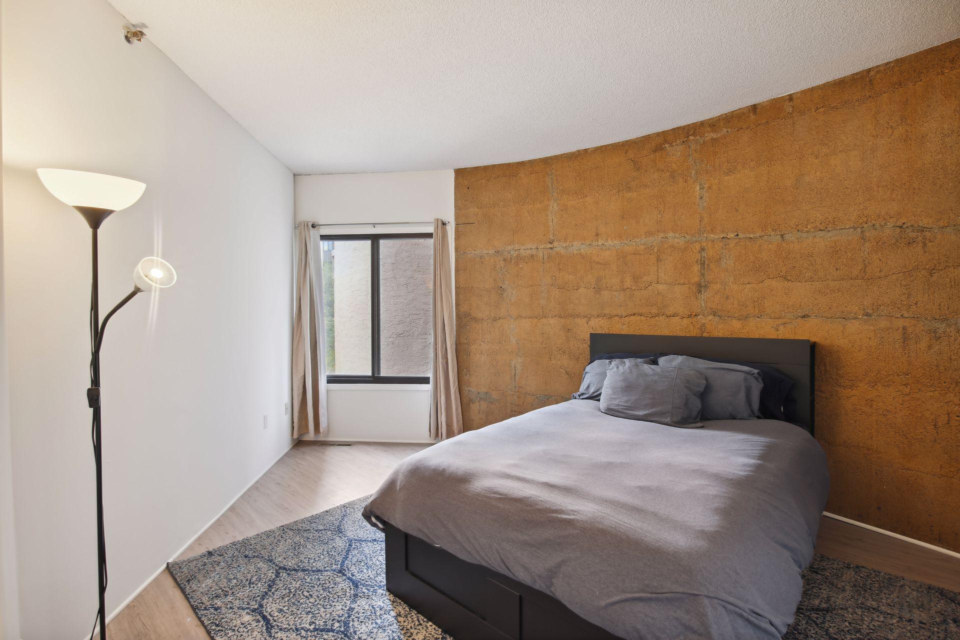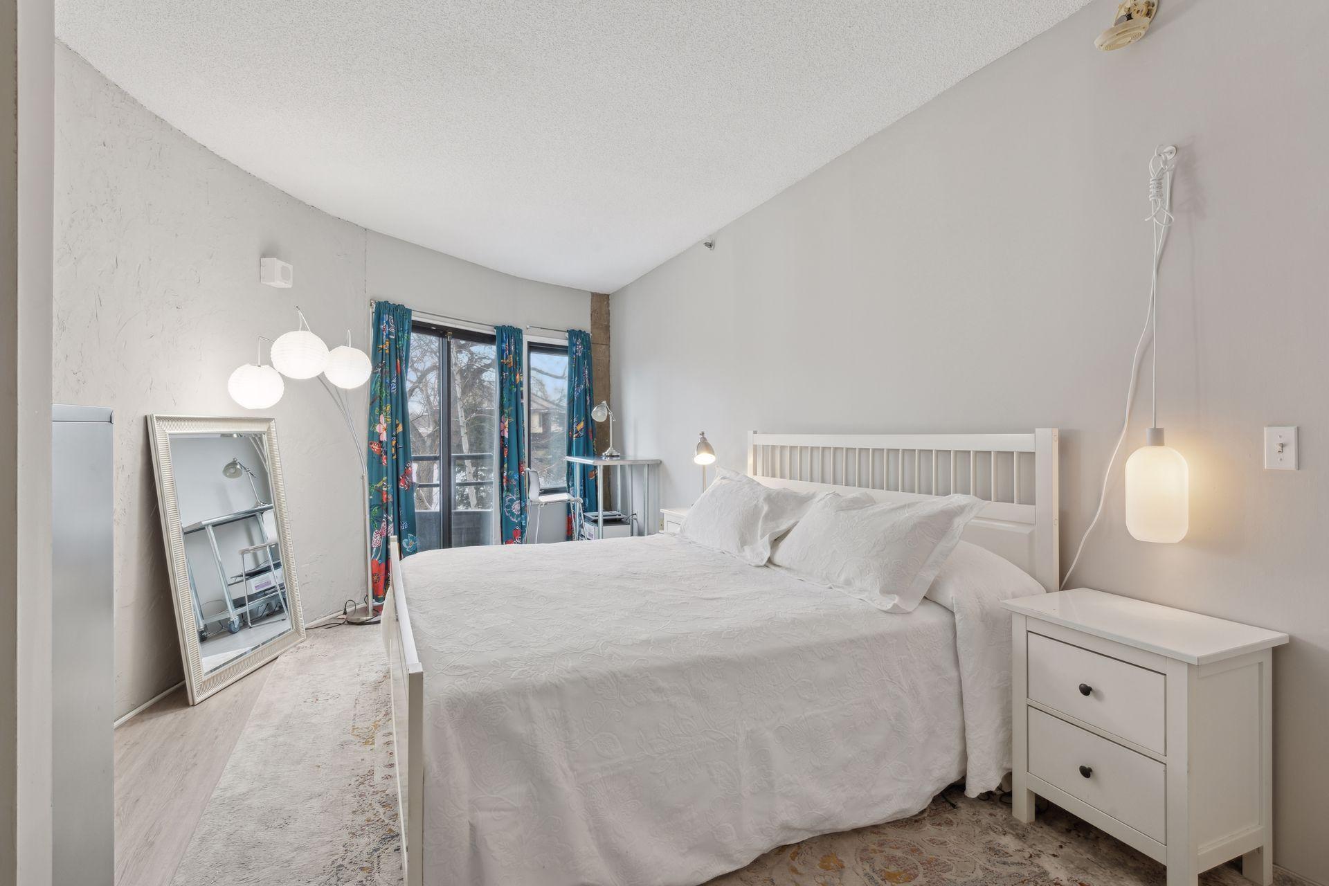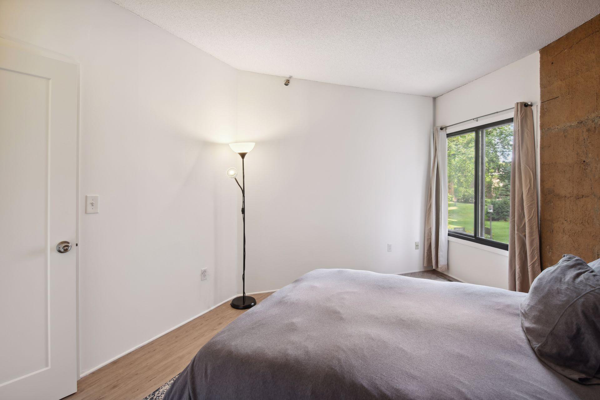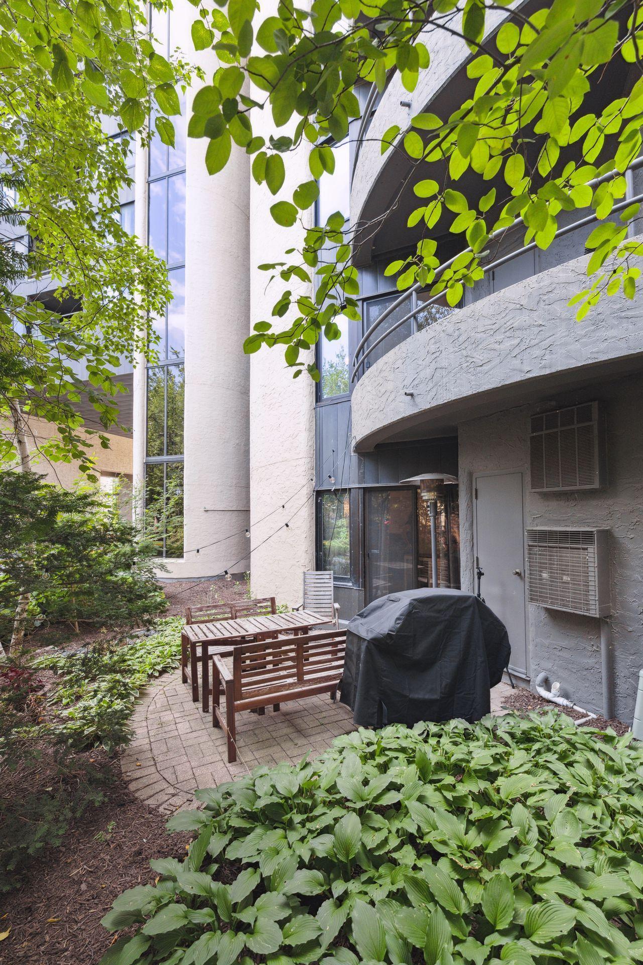 Main floor condo with private patio provides fresh air and nature right outside your door. Noise buffering concrete walls, and updated flooring throughout - hardwood on the main and vinyl on second level. The two story layout allows for separation between upstairs bedrooms (one with a private balcony), and an open concept main floor. The updated kitchen features stainless appliances, quartz counters, ample storage, and a convenient breakfast bar. Other features include in-unit laundry, updated electrical panel and 2 storage lockers. 3 owned parking spots (2 in the heated garage and one on surface lot) are a rare find. This vibrant complex offers easy access to nearby lakes, Greenway bike trails, shops, restaurants, and upcoming light rail which will travel underground in this area.