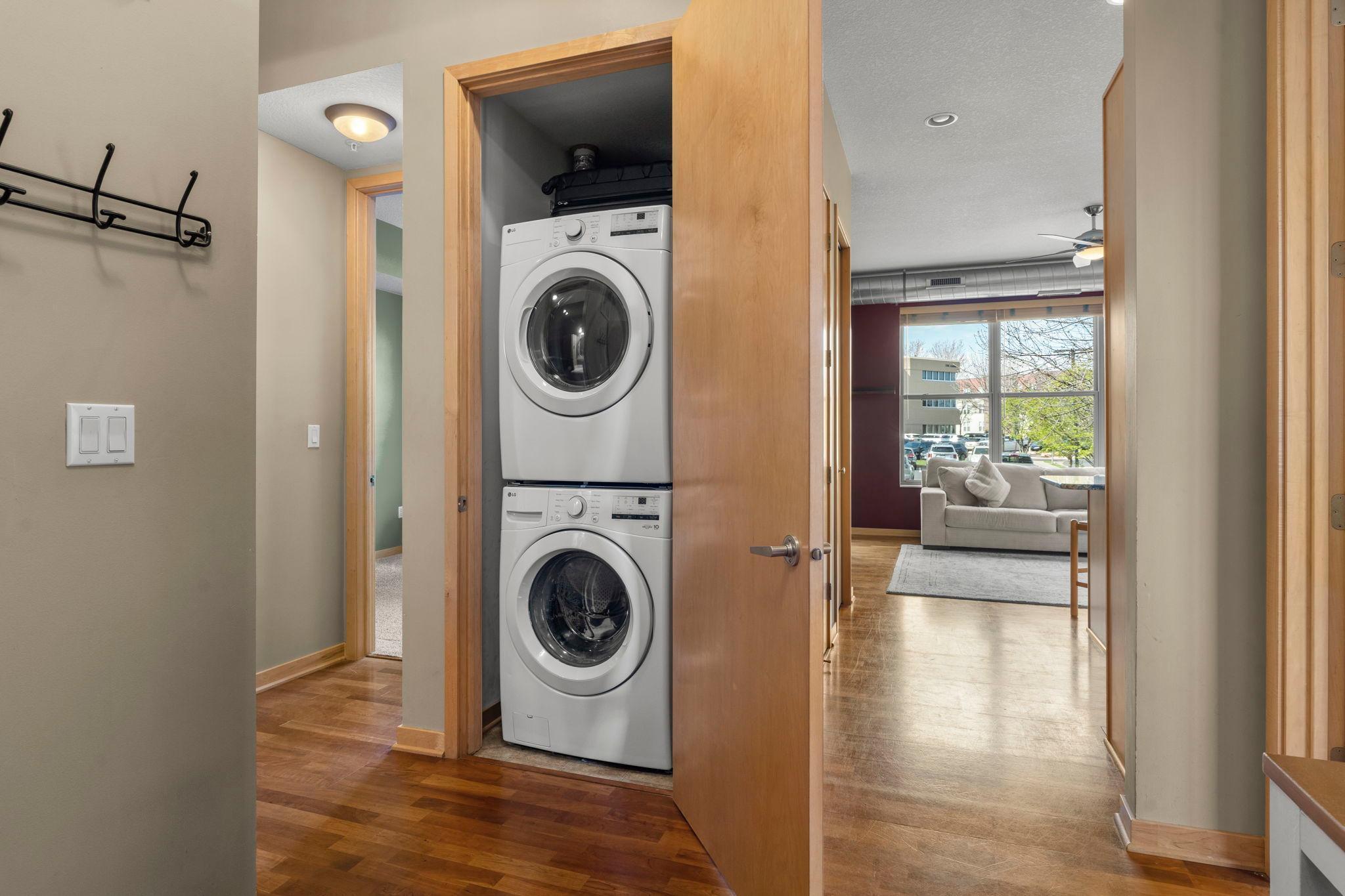 This rare two-bedroom, corner-unit condo in St. Louis Park is filled with natural light and offers a perfect balance of spacious living and modern style in a fantastic location. Soaring loft-style ceilings and oversized windows create an open, inviting feel throughout the home. The primary bedroom features a walk-in closet, while the second bedroom offers flexible use for guests, a home office, or creative space. Everyday conveniences include in-unit laundry and a private balcony for relaxing and fresh air. Significant 2025 updates provide peace of mind, including a new HVAC system, washer and dryer, updated faucets, and warm wood Hunter Douglas blinds that add a refined, finished touch. The building is exceptionally maintained with a new roof, siding, refreshed landscaping in 2024, plus balcony repainting in 2025. Residents enjoy a quiet, well-cared for community with heated underground parking, guest parking, and HOA-covered snow removal and lawn care. Just minutes from the Shops at West End and downtown Minneapolis, this location delivers unmatched access to both urban amenities and outdoor recreation. You can be on the trails or by the water within minutes-especially around Bde Maka Ska, the Chain of Lakes, and Wolfe Park. Pet-friendly and designed for effortless, low-maintenance living, this home delivers the opportunity to enjoy comfort, convenience, and lifestyle in one-where city energy, lake life, and trail access all come together right outside your door at Village Park Lofts.