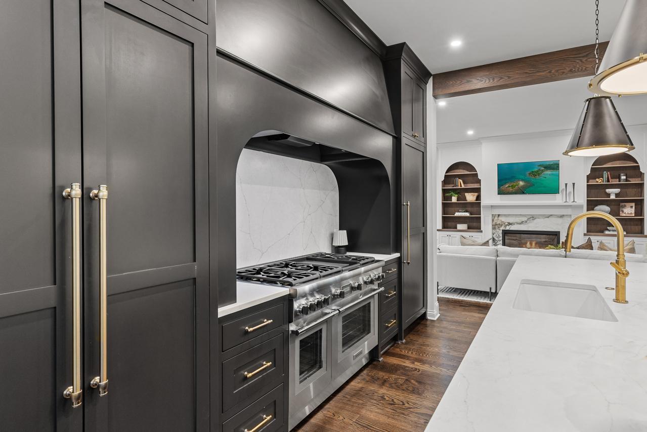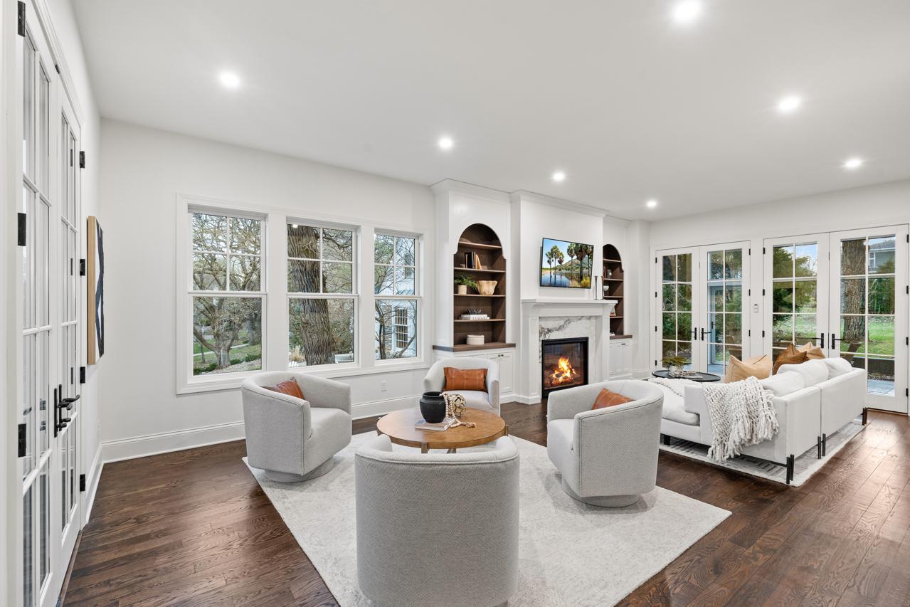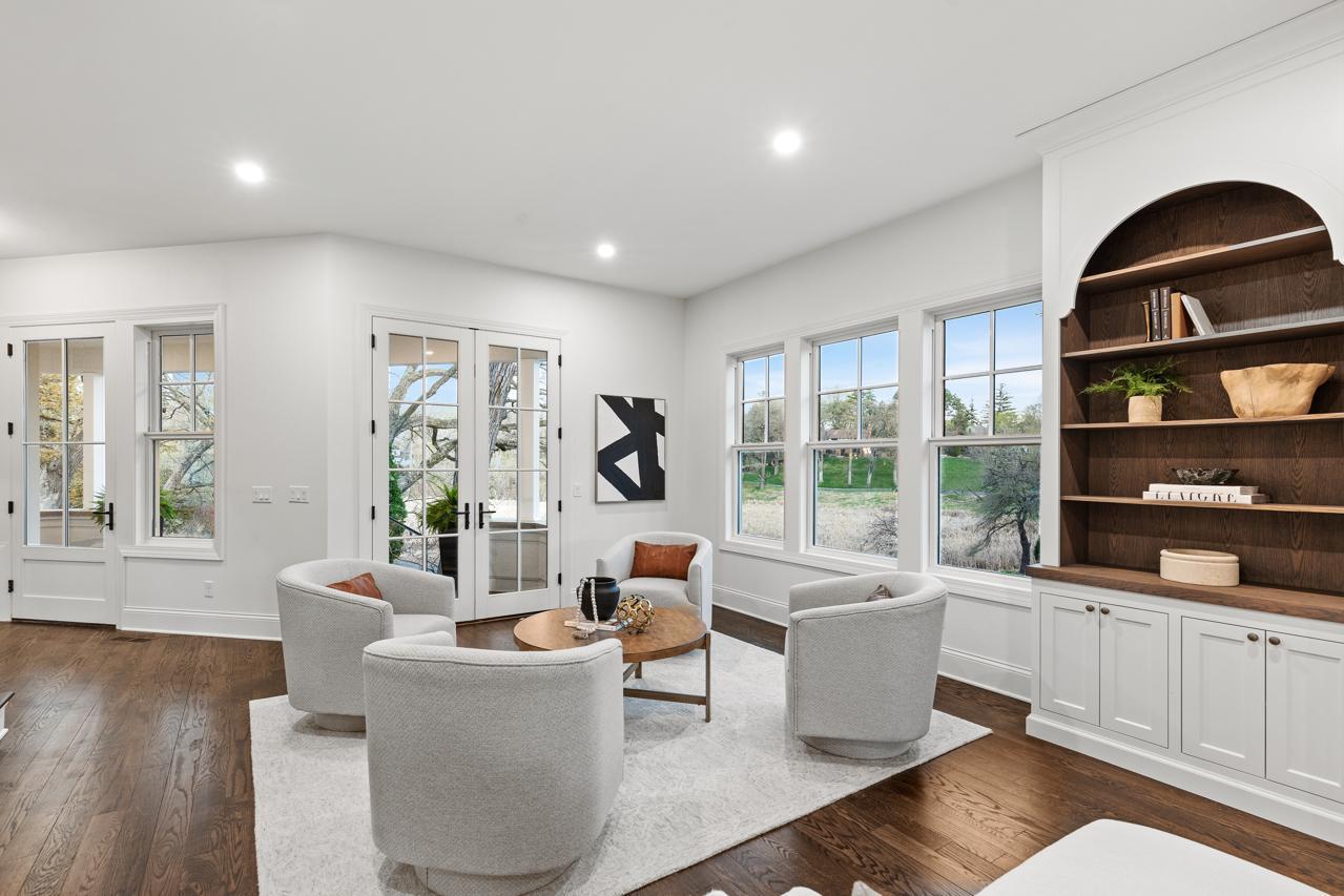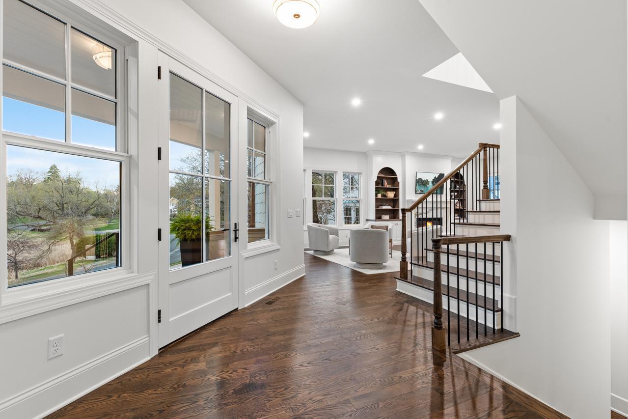 Gorgeous, custom 2-story home by Black Diamond Construction (with interior design by Kim Niosi) in Edina’s White Oaks neighborhood with convenient walkable access to the shops, restaurants, and everyday amenities of 50th & France. Thoughtfully designed and well executed, the home offers modern architecture, quality construction, and everyday comfort in a gorgeous setting. Large Kolbe Forgent Series windows and doors bring in abundant natural light while framing views of the adjacent marshland, where wildlife and changing seasons provide a peaceful backdrop. The main level features an open layout centered around a well-appointed kitchen with Thermador refrigerator and freezer concealed behind custom wood cabinetry, stone countertops, a generous center island, and a high-capacity exhaust hood. A separate food pantry and a butler’s pantry with prep space, dishwasher, and wine refrigerator support both daily living and entertaining. The living room boasts 10-foot ceilings, built-in cabinetry surrounding the fireplace, and inset French doors that create long sightlines from the front porch through to the backyard. Doors off the main living area lead to a screened porch finished with stamped concrete flooring and a Phantom retractable screen system. Upstairs, the primary suite is oriented toward the marsh with a private balcony that overlooks the beautiful natural setting. The primary suite connects to a spacious dressing area and an oversized upper-level laundry room finished with custom tile and equipped with dual washers and dryers. Bathrooms throughout the home feature individually selected tile designs, marble shower surrounds, and low-iron shower glass for a clear, refined finish. The lower level includes a family room with wet bar, a dedicated fitness room, and flexible living space suitable for both everyday use and entertaining. Mechanical features include a high-efficiency multi-stage furnace, whole-home air exchange system, radon mitigation, and fiber-optic wiring to the office. A heated four-car garage with capacity for up to six vehicles offers uncommon flexibility. The space includes EV-charging capability, interior water access, integrated floor drainage tied to an underground system, and a two-story section suitable for recreational use or hobbies. A custom 18-foot garage door opens vertically to preserve overhead clearance. Exterior infrastructure includes interior and exterior drain tile systems, underground water management, new sod and irrigation, covered gutters designed for mature trees, and a professionally managed plan protecting a century-old White Oak along with newly planted landscaping. The property combines modern design, natural views, and walkable convenience within a quiet residential setting, offering a distinctive opportunity in one of Edina’s most established neighborhoods.