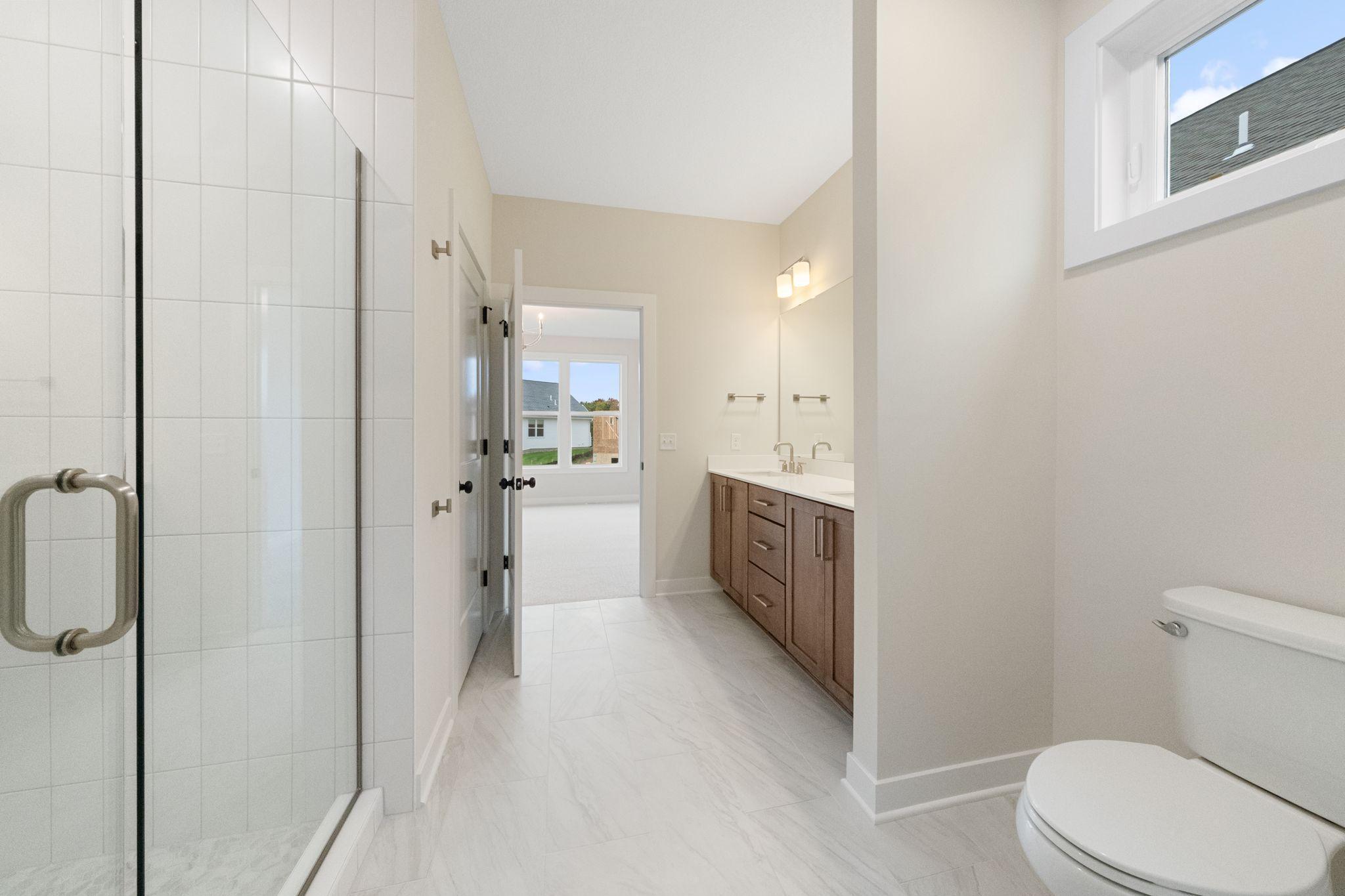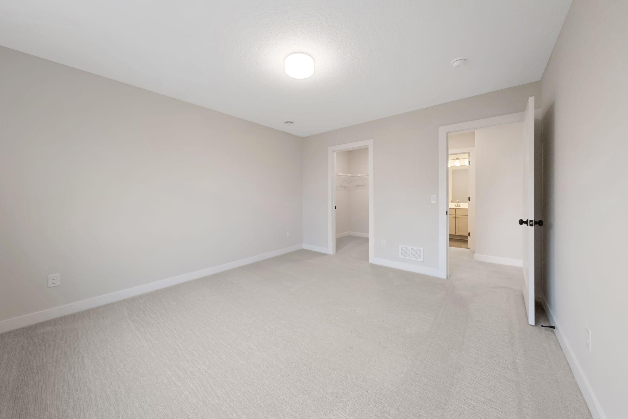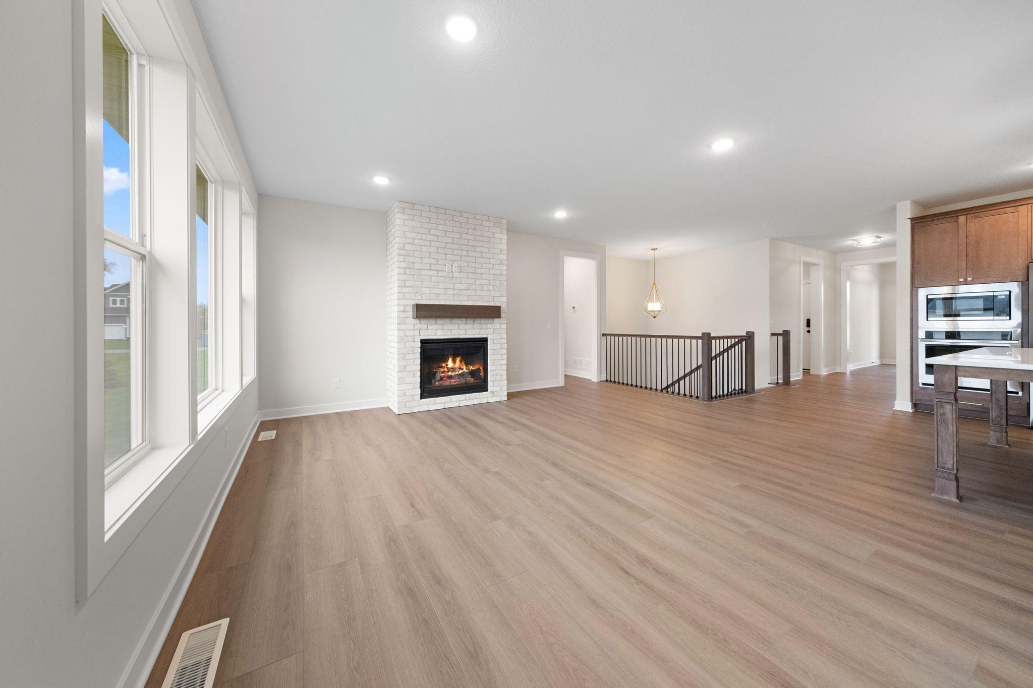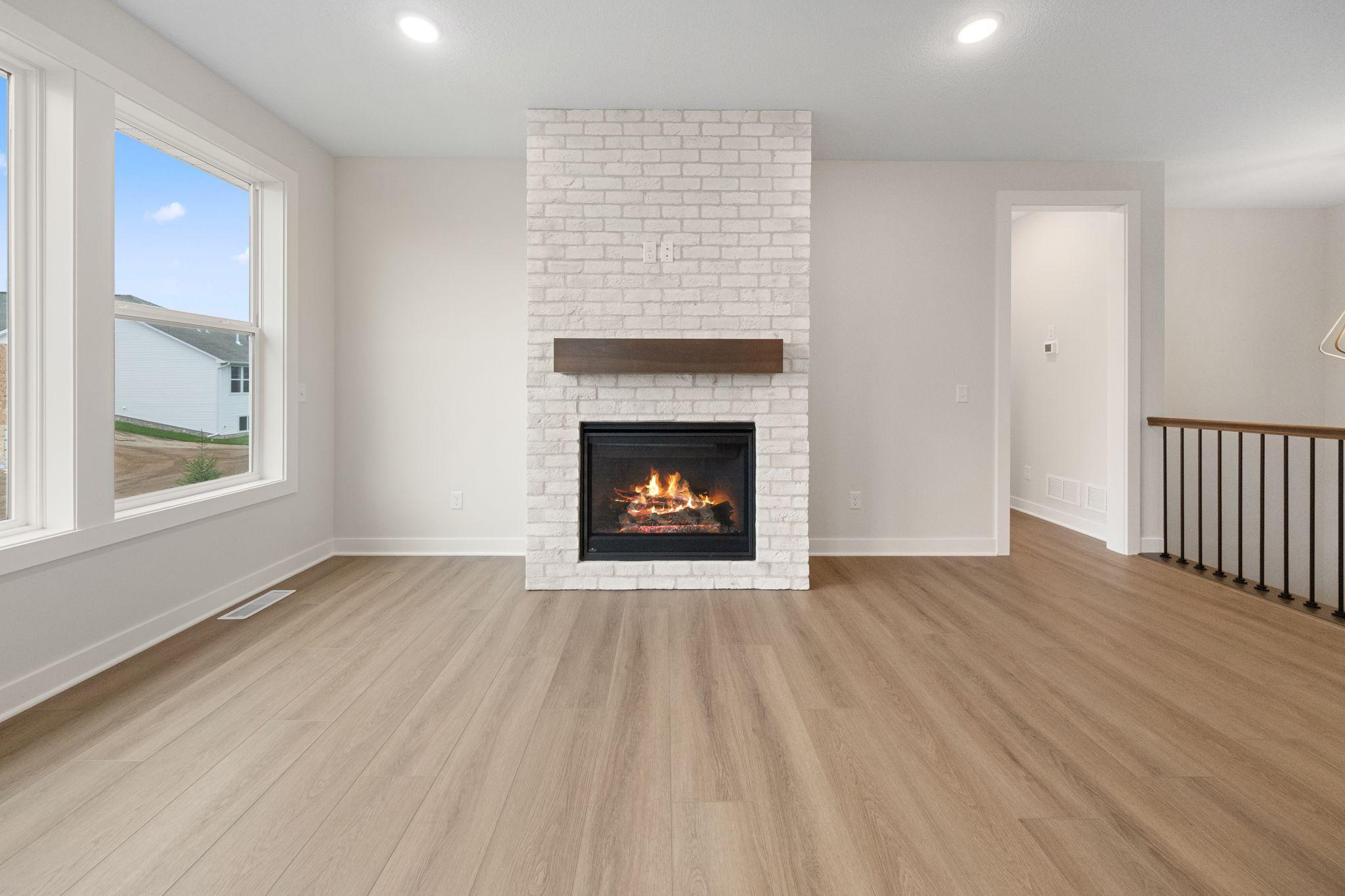 The owner’s suite offers a peaceful retreat with a seamless flow into the luxurious en-suite bathroom, walk-in closet, and directly into the main-level laundry room—providing ease and convenience no matter where you are in the home. A cozy gas fireplace in the living room adds warmth and charm to your everyday living.