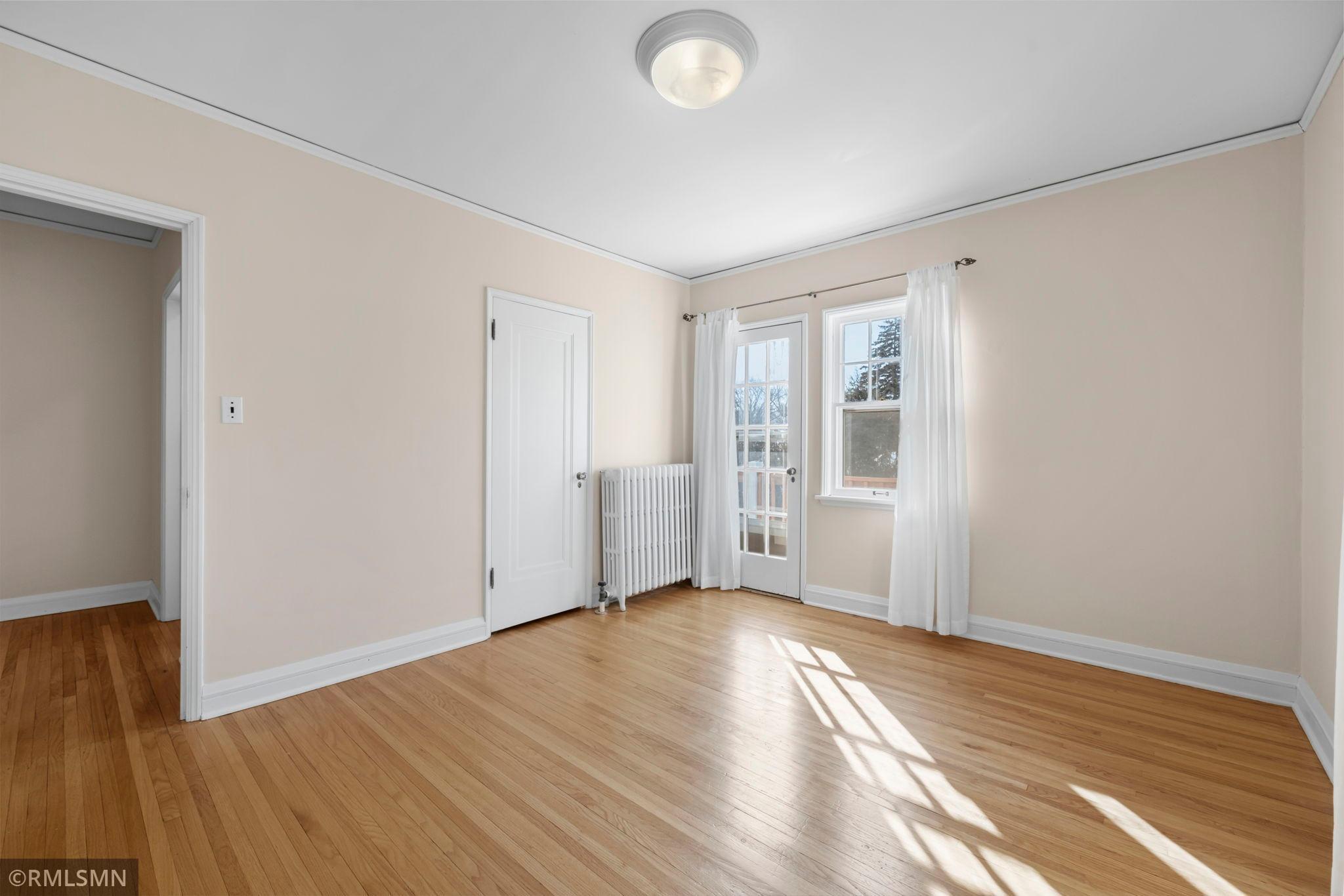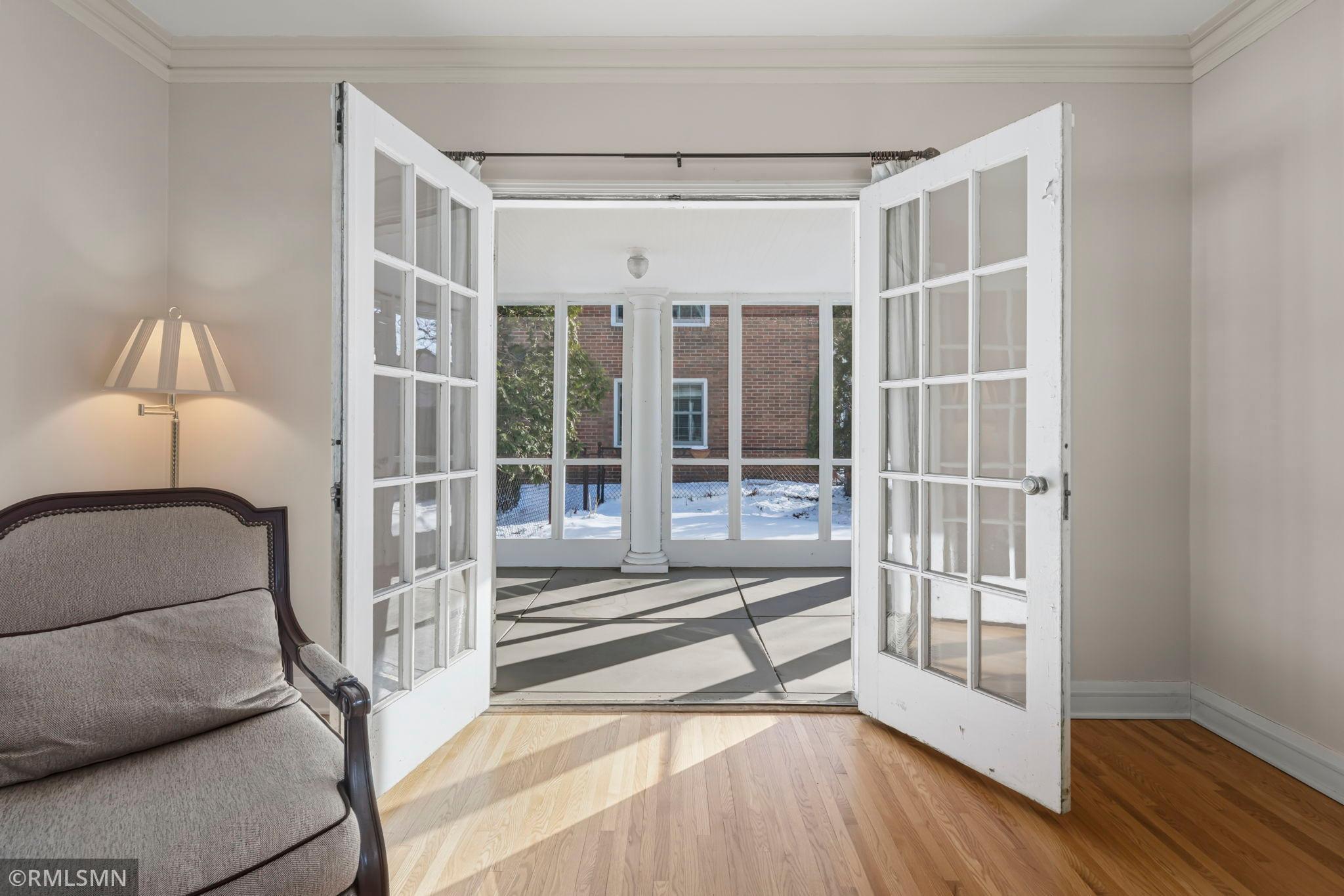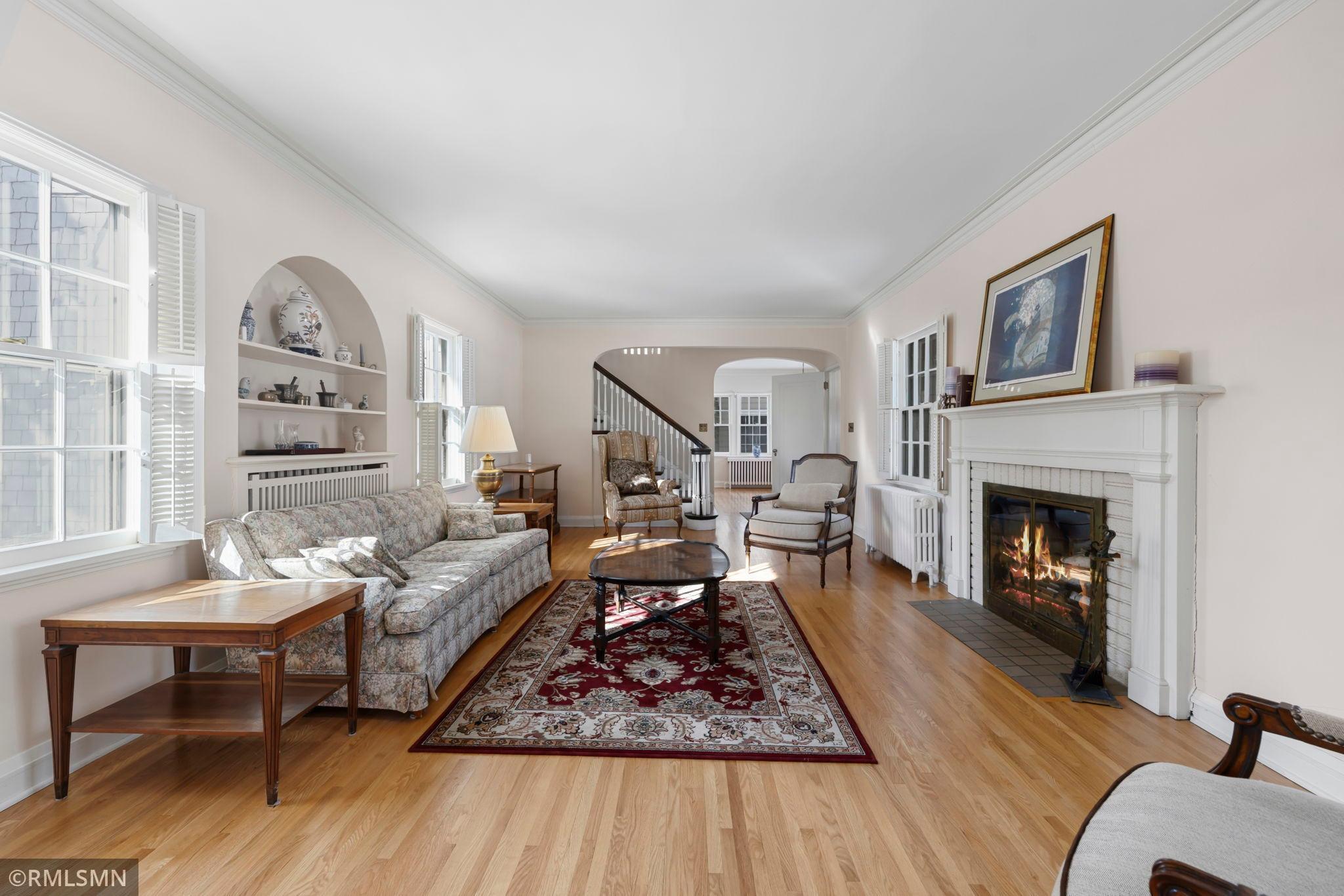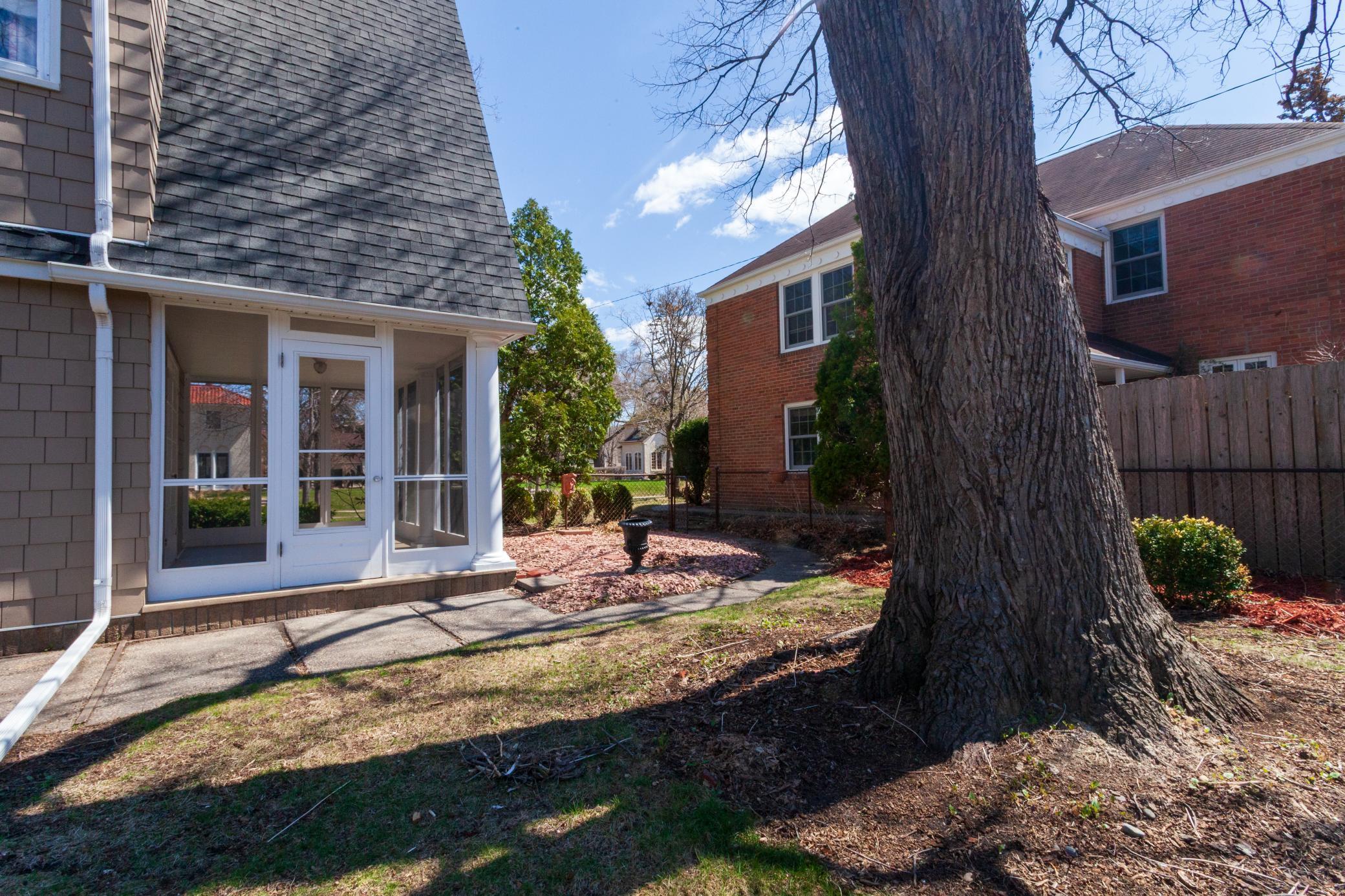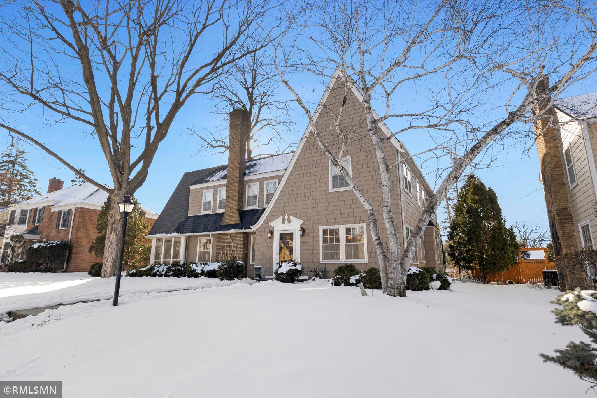 A rare opportunity to join a coveted block in the Lynnhurst neighborhood. On a generous Lot and a Half, the unique traditional 4 Bedroom, 3 bathroom home was built in 1927. Situated a half-block from Minnehaha Creek parkway, Lynnhurst Park and Burroughs Elementary, it offers easy walking distance to green spaces and miles of Parkway/walking/ biking trails and to Lake Harriet. The exterior boasts steeply pitched roof lines with French doors to a lovely screened side porch opening into the living room with a separate exterior entrance. The interior shines with immaculate wooden floors. An open, spindled staircase leads to the upper level, a generous upper windowed landing and access to each of the 4 bedrooms, a full bath, and a lovely 3/4 bath with a walk-in shower. The second level has 4 spacious bedrooms with more beautiful hardwood floors. The Master Bedroom has a walk-in closet with a window and 2 separate interior closets, and the 4th bedroom is attached to an outdoor deck/balcony. The house is trimmed with extensive crown moldings and baseboards. The living room has a mantled brick-faced, glass-enclosed fireplace between shuttered windows, and an arched built-in shelving feature. The living room continues past the open staircase and flows into the formal dining room, which is adjacent to the separate eat-in kitchen. The kitchen has stainless appliances, with new refrigerator and range, high ceilings and large windows. In the rear of the house there is a large, sunny family room with a gas brick fireplace and an adjacent half bath. The spacious fenced back yard has mature trees, and spaces to enjoy time on the patio. The extra large lot offers exceptional space to create beautiful gardens. A detached double garage and a concrete driveway off the alley for up to 3 cars supplements available on-street parking on Irving Avenue.