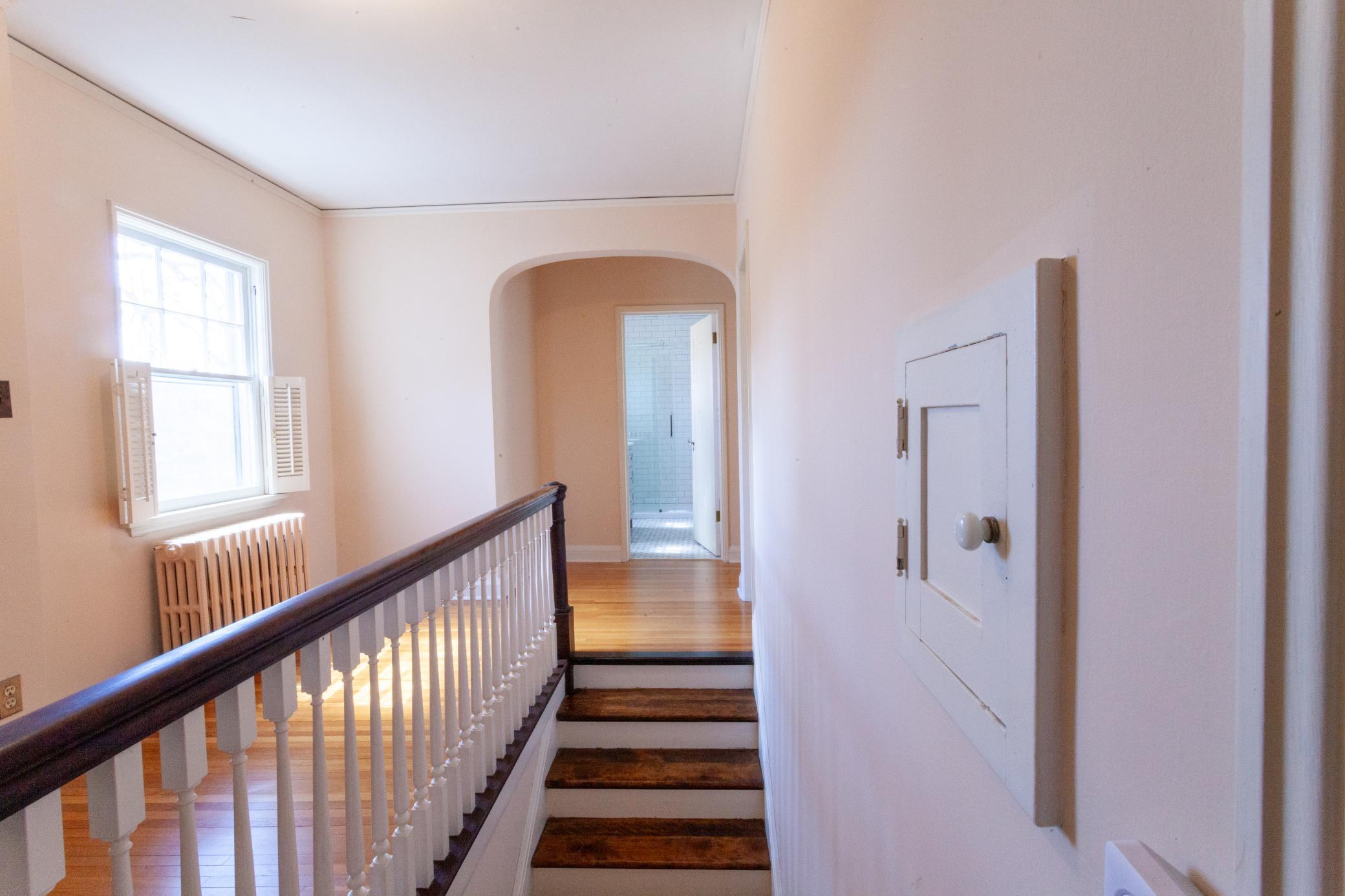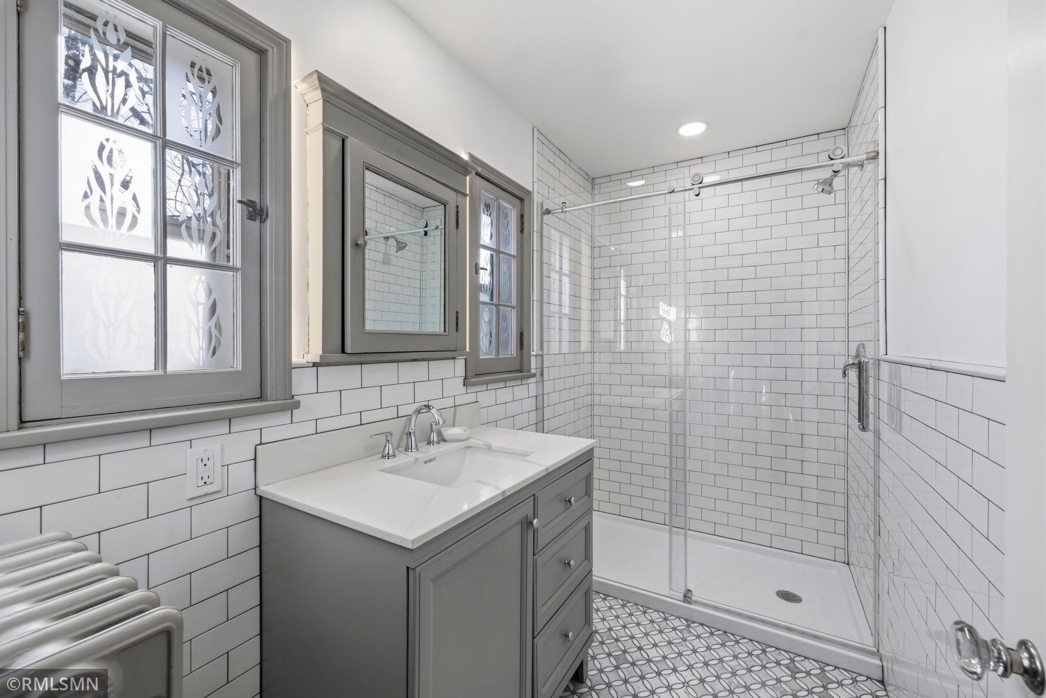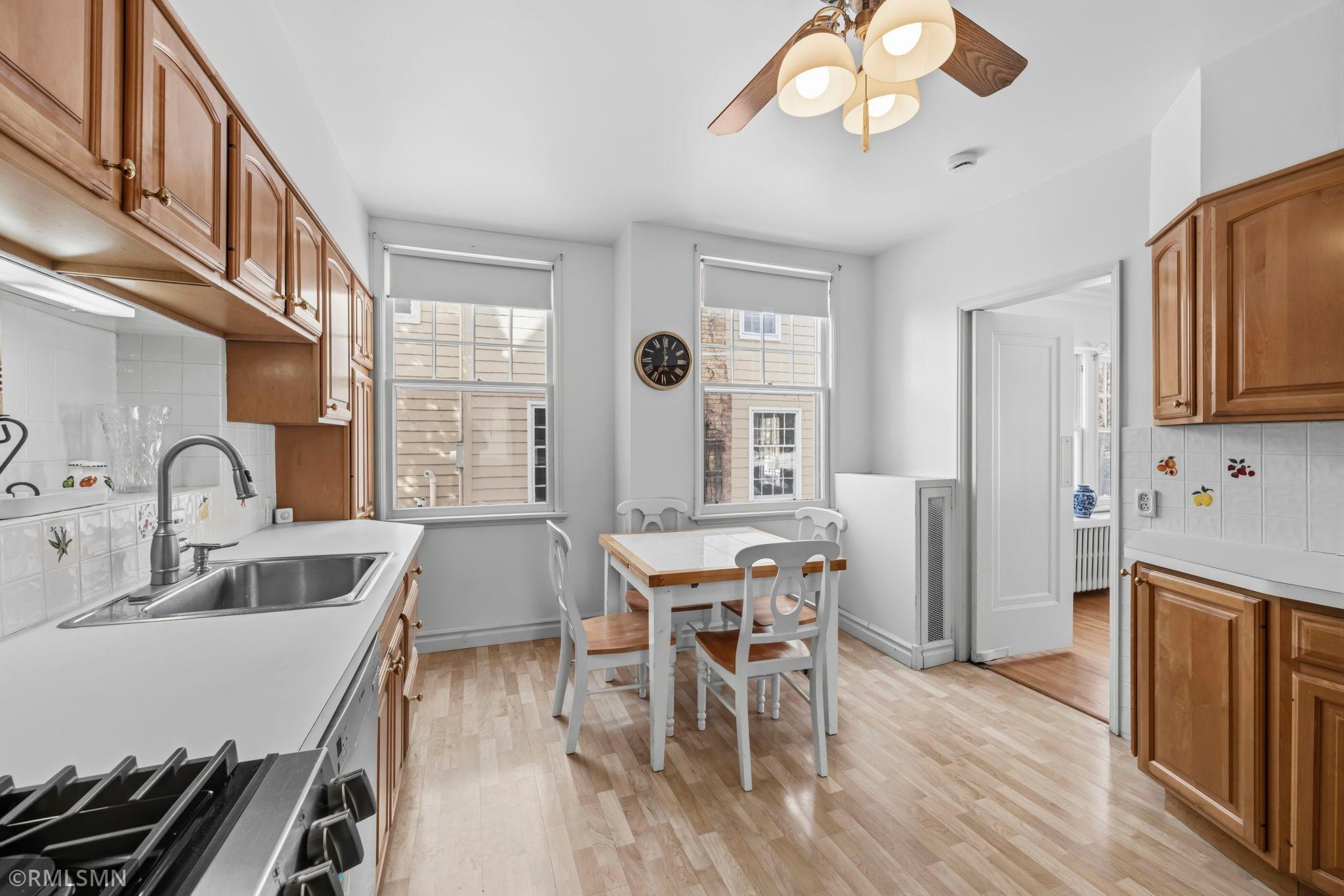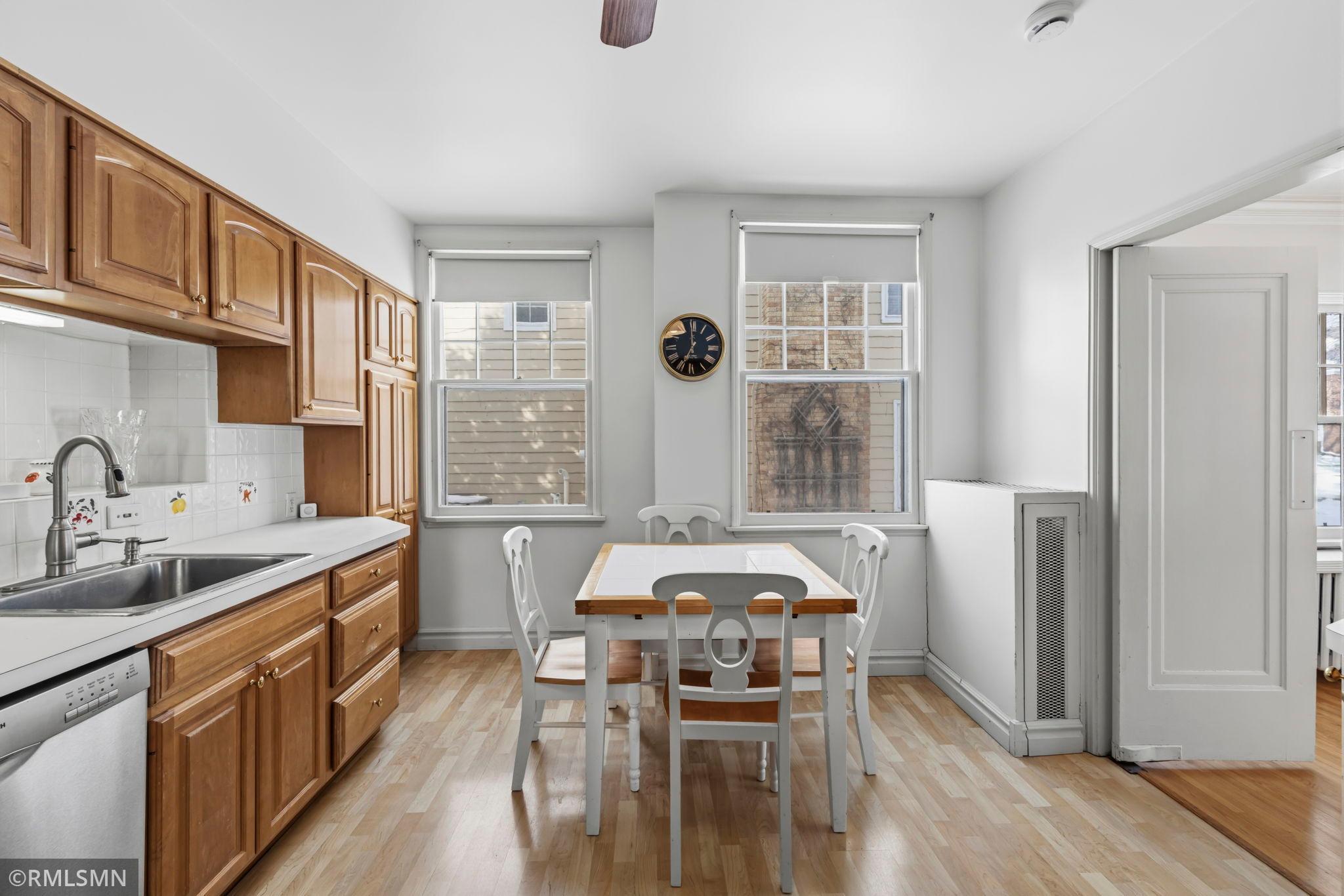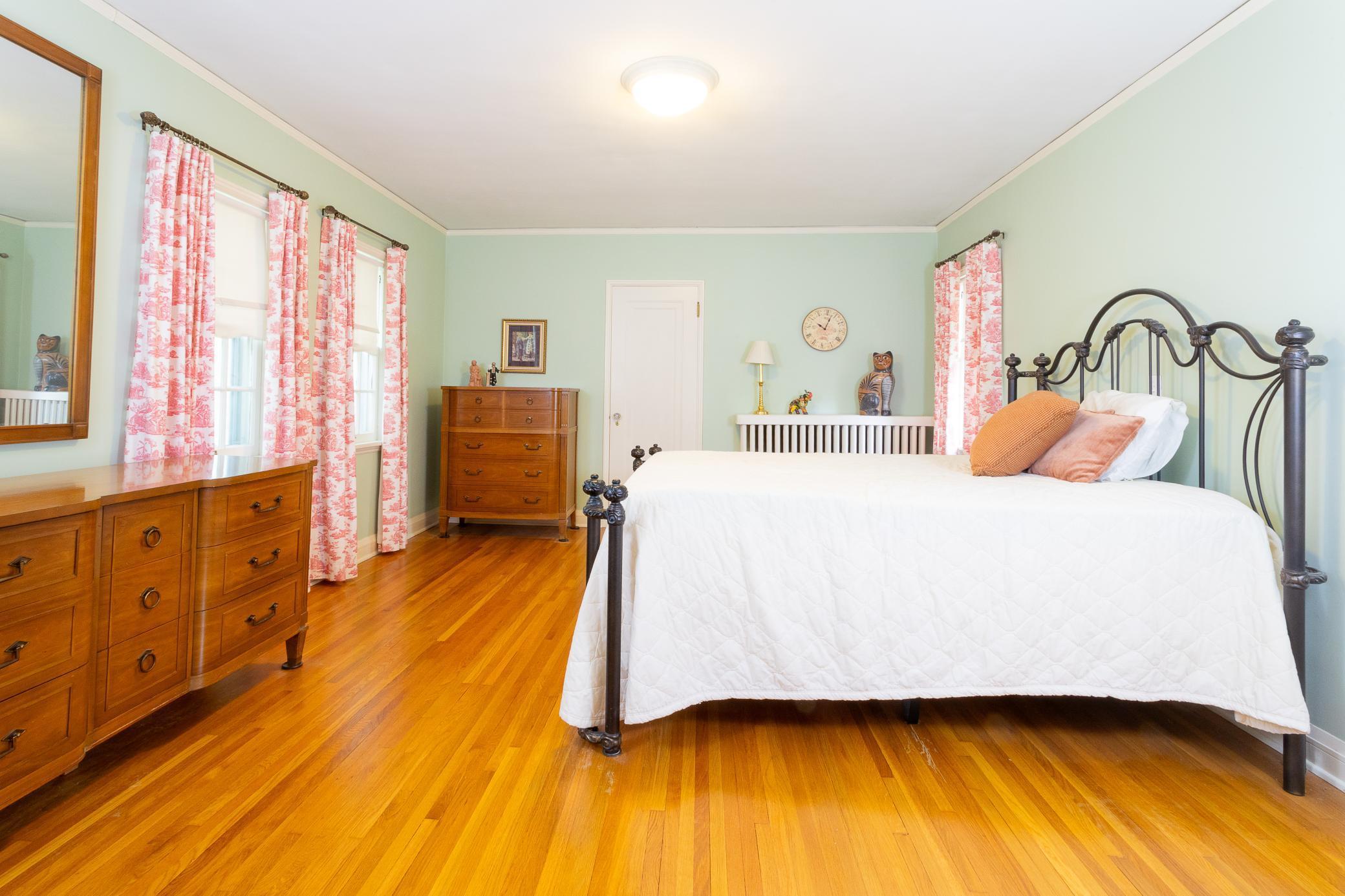 A rare opportunity to join a coveted block in the Lynnhurst neighborhood. On a generous Lot and a Half, the unique traditional 4 Bedroom, 3 bathroom home was built in 1927. Situated a half-block from Minnehaha Creek parkway, Lynnhurst Park and Burroughs Elementary, it offers easy walking distance to green spaces and miles of Parkway/walking/ biking trails and to Lake Harriet. The exterior boasts steeply pitched roof lines with French doors to a lovely screened side porch opening into the living room with a separate exterior entrance. The interior shines with immaculate wooden floors. An open, spindled staircase leads to the upper level, a generous upper windowed landing and access to each of the 4 bedrooms, a full bath, and a lovely 3/4 bath with a walk-in shower. The second level has 4 spacious bedrooms with more beautiful hardwood floors. The Master Bedroom has a walk-in closet with a window and 2 separate interior closets, and the 4th bedroom is attached to an outdoor deck/balcony. The house is trimmed with extensive crown moldings and baseboards. The living room has a mantled brick-faced, glass-enclosed fireplace between shuttered windows, and an arched built-in shelving feature. The living room continues past the open staircase and flows into the formal dining room, which is adjacent to the separate eat-in kitchen. The kitchen has stainless appliances, with new refrigerator and range, high ceilings and large windows. In the rear of the house there is a large, sunny family room with a gas brick fireplace and an adjacent half bath. The spacious fenced back yard has mature trees, and spaces to enjoy time on the patio. The extra large lot offers exceptional space to create beautiful gardens. A detached double garage and a concrete driveway off the alley for up to 3 cars supplements available on-street parking on Irving Avenue.