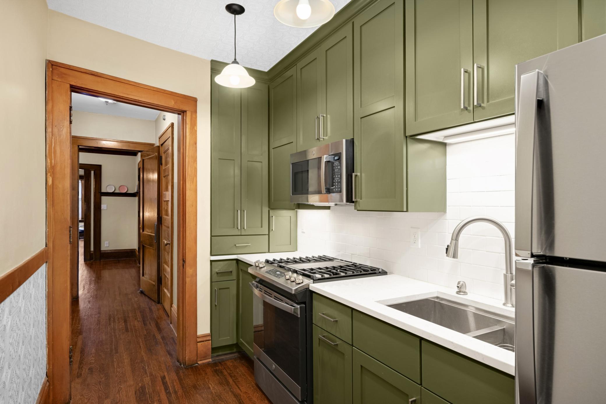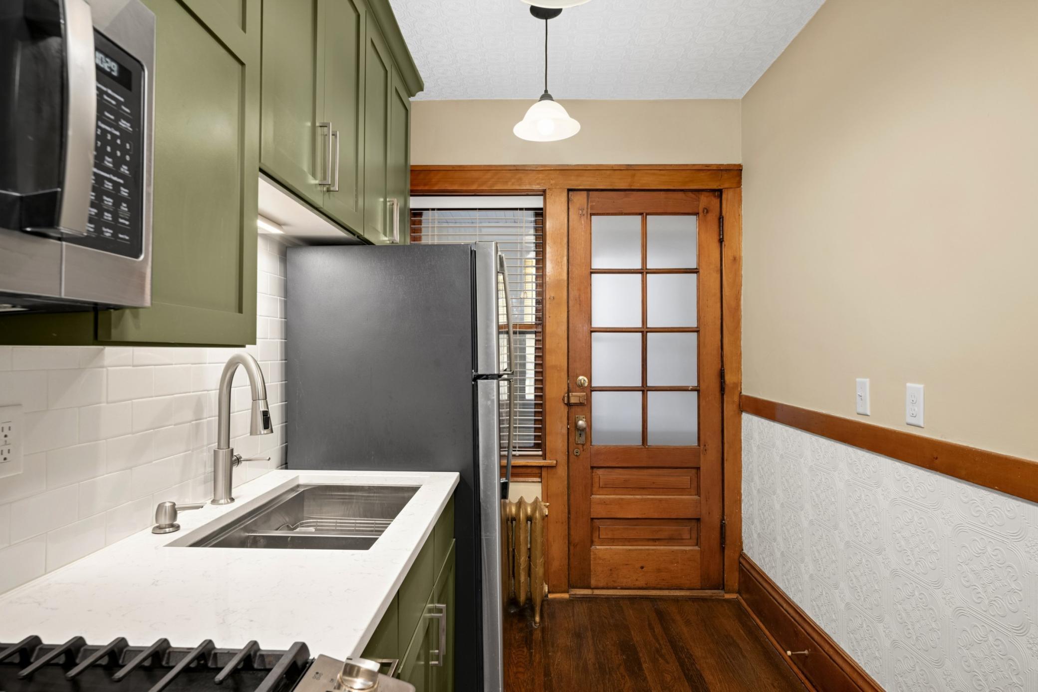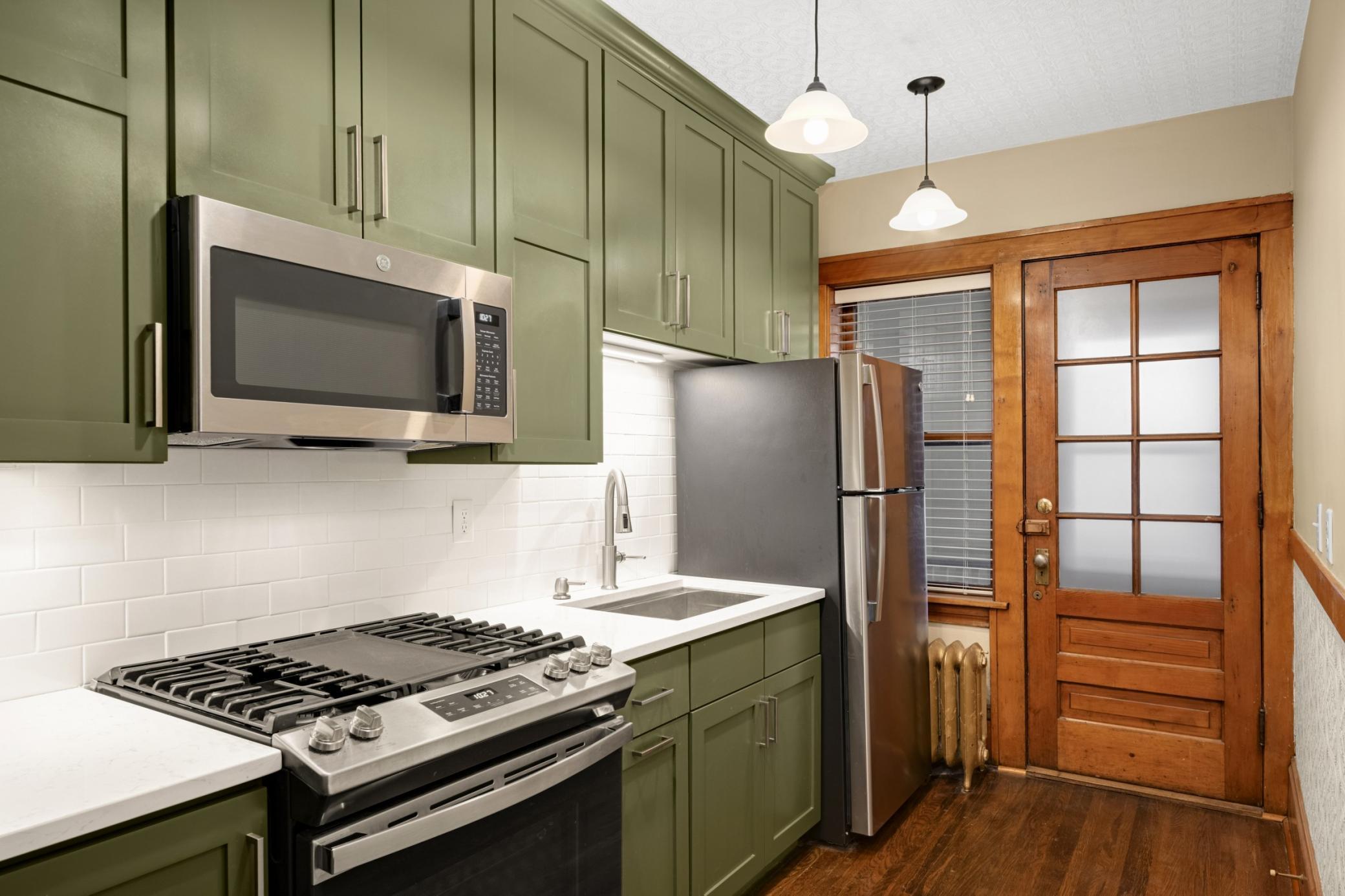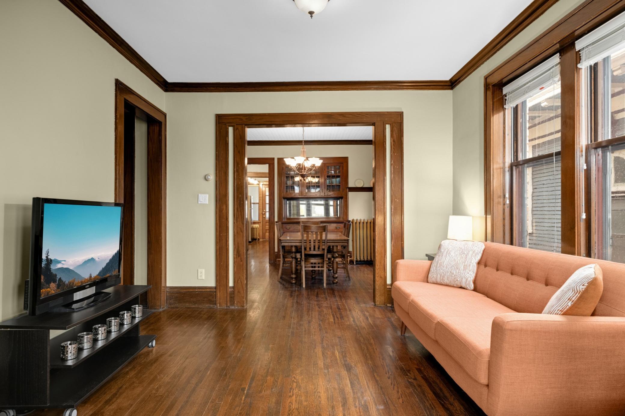 This beautifully maintained one-bedroom condo combines old-world charm with modern updates, offering the convenience of easy, one-level living. Gleaming hardwood floors flow throughout, creating a warm and inviting atmosphere, A bright, sun-filled sunroom provides the perfect space for a home office or cozy retreat. The spacious dining room features a classic built-in buffet, ideal for entertaining or additional storage. The updated bathroom showcases elegant ceramic tile and a stunning tiled floor. The fully renovated custom kitchen is a standout, complete with stainless steel appliances, quartz countertops, and stylish finishes. Enjoy abundant closet space throughout, plus an additional storage locker in the lower level. An off-street parking pad adds extra convenience. Ideally located just steps from popular restaurants, shopping, and easy highway access, this condo offers the perfect blend of character, comfort, and location.