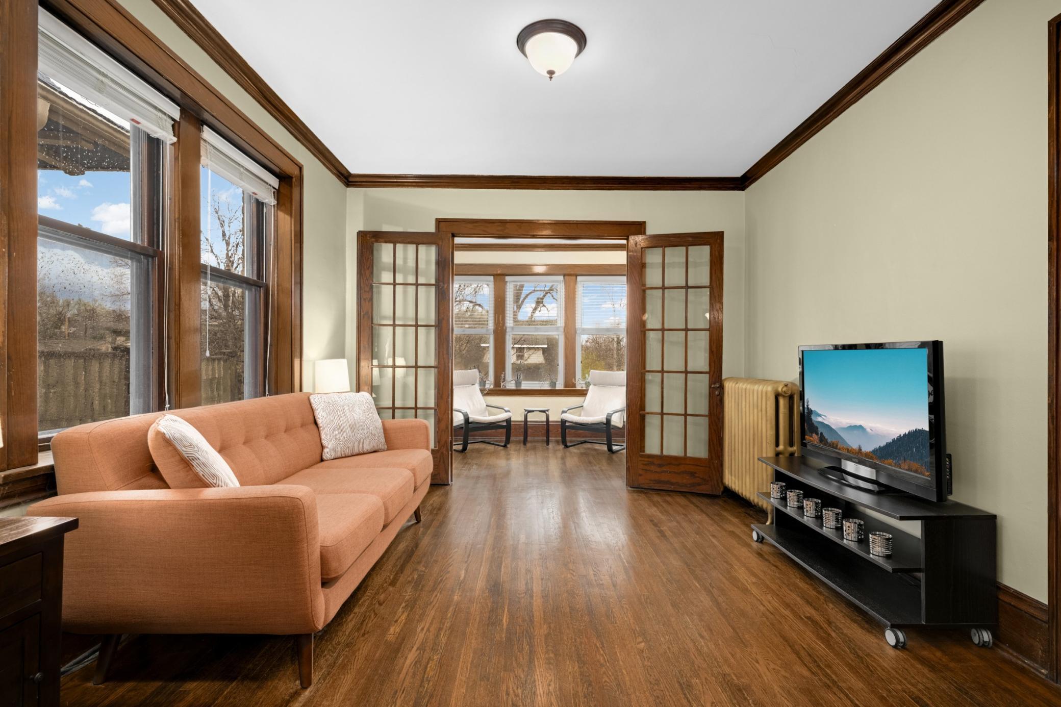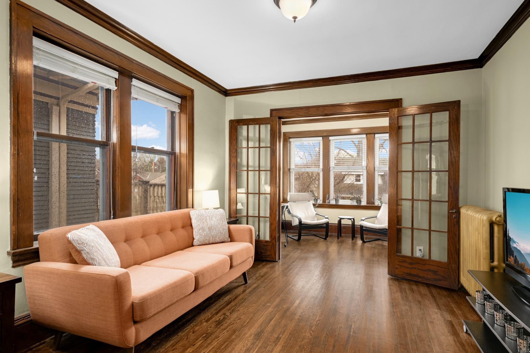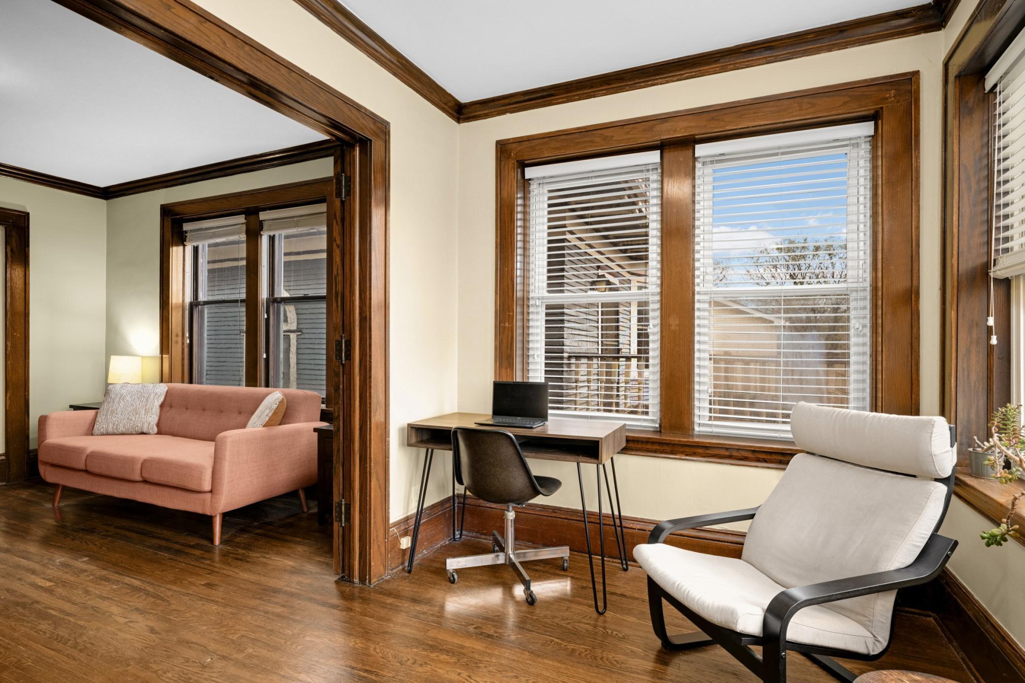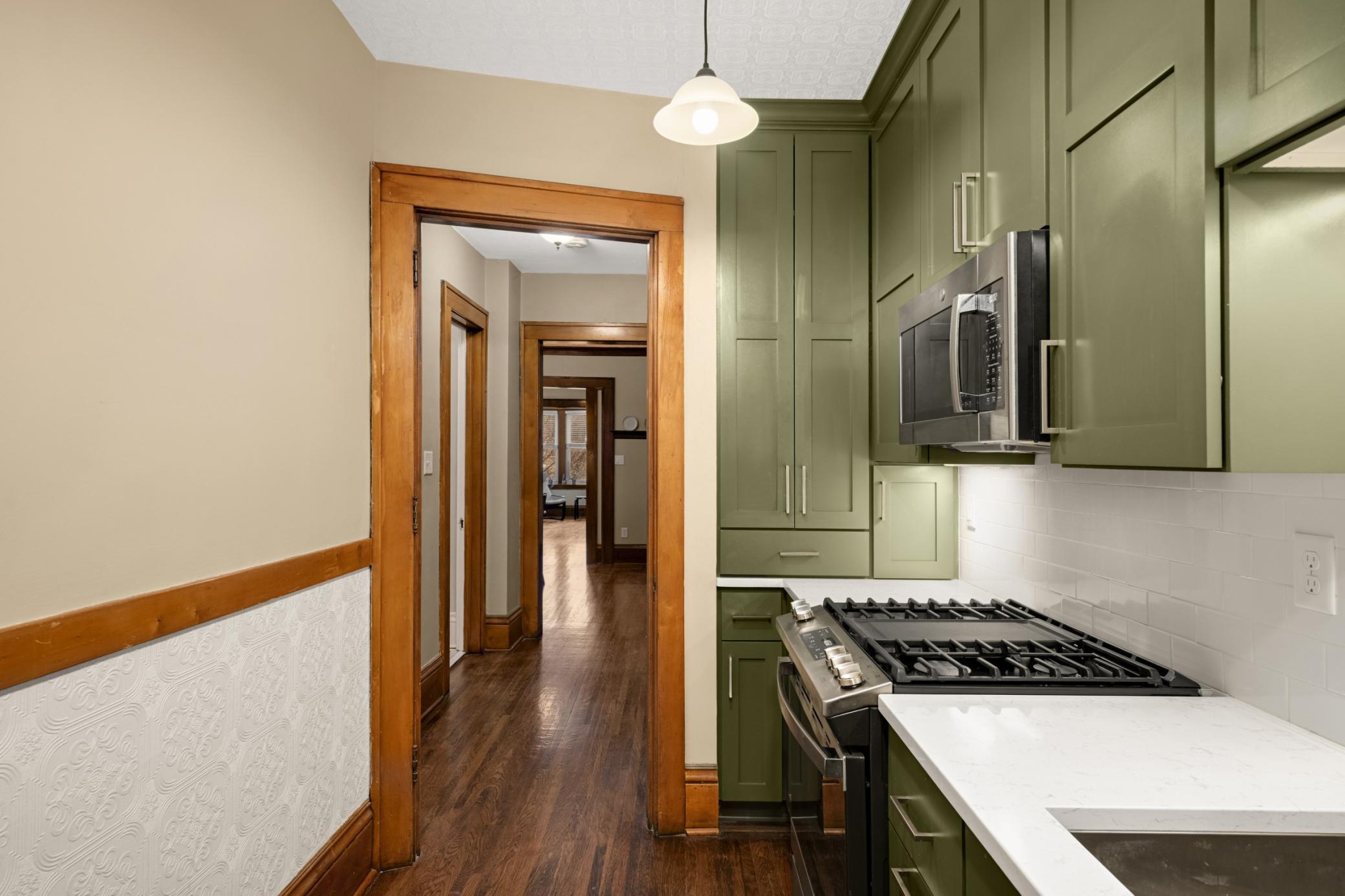 This beautifully maintained one-bedroom condo combines old-world charm with modern updates, offering the convenience of easy, one-level living. Gleaming hardwood floors flow throughout, creating a warm and inviting atmosphere, A bright, sun-filled sunroom provides the perfect space for a home office or cozy retreat. The spacious dining room features a classic built-in buffet, ideal for entertaining or additional storage. The updated bathroom showcases elegant ceramic tile and a stunning tiled floor. The fully renovated custom kitchen is a standout, complete with stainless steel appliances, quartz countertops, and stylish finishes. Enjoy abundant closet space throughout, plus an additional storage locker in the lower level. An off-street parking pad adds extra convenience. Ideally located just steps from popular restaurants, shopping, and easy highway access, this condo offers the perfect blend of character, comfort, and location.
