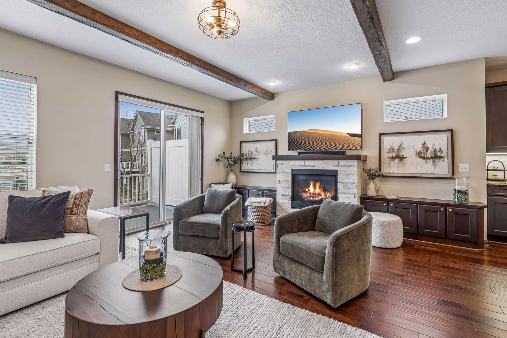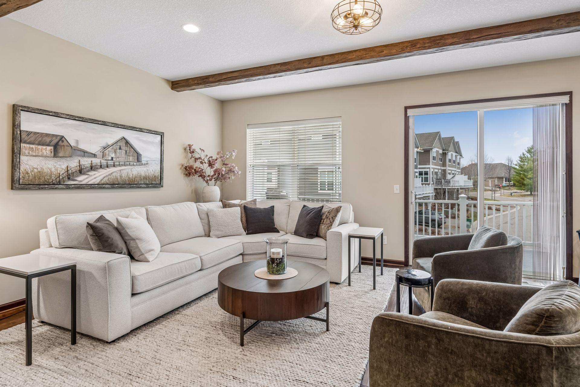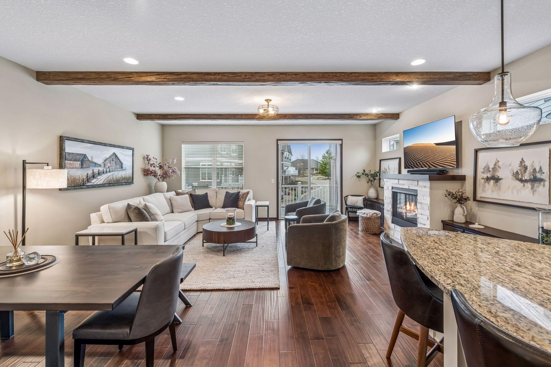 Public Remarks: Like model home, end unit in Stone Bay Community! Bright and open floor plan with 9 ft ceilings and lots of windows. Beamed ceilings, hardwood floors, new light fixtures, Sonos stereo system, owner's suite with fireplace and closet organizers. Fantastic kitchen with center island, granite counters with stainless hood and walk-in pantry. Spacious great room with gas fireplace and built-ins. Perfect for entertaining. Sun Room overlooking the front porch is great sitting room to relax or a main floor office. Upper level has two bedrooms and a loft area for a tv room, sitting room, office or study space. Owner's suite has a walk-in closet and luxurious bathroom with large walk-in shower and soaking tub. Lower level has an exercise family room with a convenient three-quarter bath. Heated garage with epoxy floor and "diamond plated" crown molding and trim is amazing. Easy access to trails, lakes, Baker Park, and downtown Wayzata. House currently has Ring Security System. Upon sale of the home, furniture in the house is available for sale.